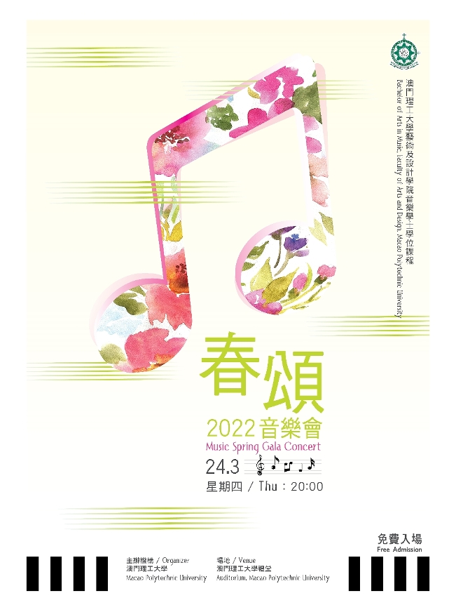 澳門理工大學藝術及設計學院主辦的“春頌”音樂會,將於3月24日晚上八時,在該校禮堂舉行,主要由音樂課程學生擔綱演出,透過多首中西樂曲展現青春風采,並向社會展示教學成果,呈獻充滿青春氣息的音樂盛宴,精彩可期。