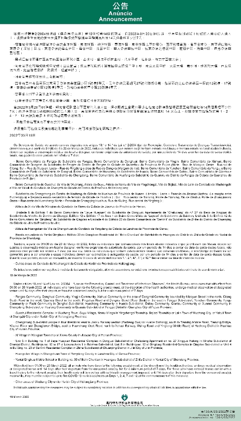 新型冠狀病毒感染應變協調中心(下稱應變協調中心)宣佈,因應內地的疫情變化,衛生局根據第2/2004號法律《傳染病防治法》第10條和第14條的規定,自2022年3月20日凌晨1時起,所有曾經到過以下地點的入境及已入境人士,須按照衛生當局的要求在指定地點接受醫學觀察至離開當地後14天但最短不少於7天:福建省泉州市豐澤區豐澤街道的豐澤社區、東淮社區、迎津社區、霞淮社區、東美社區北至妙雲街、西至刺桐南路、南至泉秀街、東至坪山路和東霞街(河岸)區域,東海街道的雲山社區、雲谷社區、法石社區,華大街道華城社區,城東街道的埭頭社區、前頭社區、潯美社區,泉秀街道華豐社區;黑龍江省哈爾濱市五常市的五常鎮國稅小區、古榆村、營城子鄉南土村、八家子鄉、拉林鎮,尚志市亞布力鎮;湖南省懷化市鶴城區城中街道(四至範圍:東至焦柳鐵路(富程國際至懷鐵二中)段,南至天星中路、天星大橋、舞水河、張家灣大橋,西至環城西路,北至渝懷鐵路、武陵路、迎豐中路);河南省焦作市修武縣王屯鄉習村;吉林省吉林市昌邑區的東局子街道嘉業花園小區1號樓5單元、民主街道興國胡同27號岔路鄉公寓,船營區的北山街道樂園一區的12號樓、17號樓、青島街道慶豐小區12號樓5單元、致和街道森鄰里小區23號樓4單元;甘肅省蘭州市永登縣上川鎮黃茨灘村;山東省煙台市芝罘區的煙台青華中學、黃務街道柏林春天33號樓。