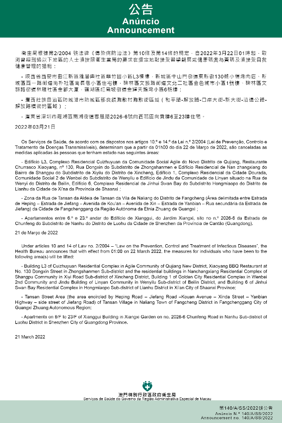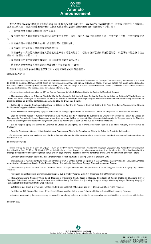 新型冠狀病毒感染應變協調中心(下稱應變協調中心)宣佈,因應內地的疫情變化,衛生局根據第2/2004號法律《傳染病防治法》第10條和第14條的規定,自2022年3月22日凌晨1時起,所有曾經到過以下地點的入境及已入境人士,須按照衛生當局的要求在指定地點接受醫學觀察至離開當地後14天但最短不少於7天:上海市嘉定區馬陸鎮康年路261號工地宿舍;廣西壯族自治區欽州市欽北區板城鎮那覓村中和棠、那覓,欽南區沙埠鎮大嶺村東下隊、沙寮村委下沙村、沙寮村委黃歧洞村;安徽省銅陵市郊區金御華府30棟、銅官區新苑小區三期2棟;陝西省銅川市耀州區正陽路街道鴻翔逸境小區;湖南省長沙市天心區大托鋪街道火雲山莊烤全羊店(湘江南路店),懷化市鶴城區城南街道四至範圍:東至環城東路沿線(包含楊村村、橋樑村、水壟村);福建省漳州市龍文區蘇菲辣蹦酒吧(水仙大街88號融信酒店e棟);遼寧省大連市普蘭店區豐榮街道體育路6號、平安里80號、128號。
