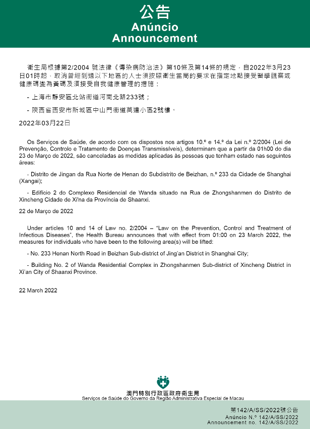 新型冠狀病毒感染應變協調中心(下稱應變協調中心)宣佈,因應內地的疫情變化,衛生局根據第2/2004號法律《傳染病防治法》第10條和第14條的規定,自2022年3月23日凌晨1時起,所有曾經到過以下地點的入境及已入境人士,須按照衛生當局的要求在指定地點接受醫學觀察至離開當地後14天但最短不少於7天:山東省濱州市陽信縣翟王鎮、金陽街道辦事處北八里村、洋湖鄉勃李村,鄒平市黃山街道辦事處張山村、韓店鎮西王新村或上口村,惠民縣孫武街道辦事處怡水龍城小區、環城南路108號;天津市河北區月牙河街大江路菜老樂蔬菜店(含薊縣雞蛋店);上海市浦東新區北蔡鎮聯勤村馮橋南宅;河南省焦作市修武縣城鎮辦城南社區政後街合歡小區、產業集聚區雲翔紡織廠,修武縣王屯鄉後南孟村、前董村、後董村,修武縣郇封鎮大文案村、大位村、小營村、陳村;湖南省長沙市芙蓉區文藝路街道五一大道351號院內居住區、韭菜園街道杜家園巷2號全院;福建省泉州市晉江市陳埭鎮洋埭村、海尾村,德化縣龍潯鎮丁溪村;福建省廈門市同安區五顯鎮後塘村寨仔山里,思明區蓮前街道明發商城小區(西林路22-40號),湖里區殿前街道小東山社1號晨鷺公寓。
