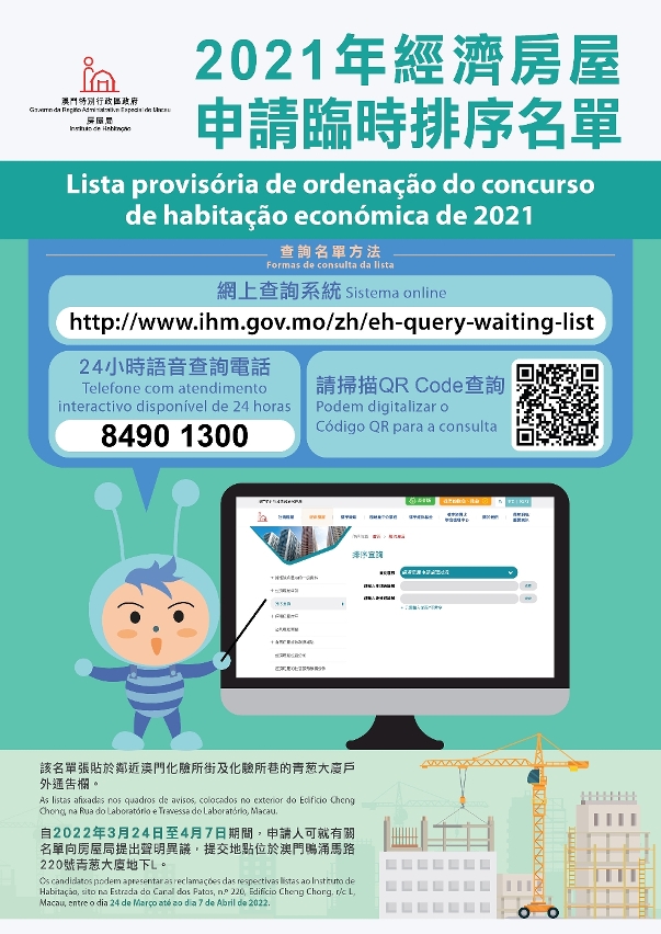 為配合防疫工作,房屋局呼籲申請人善用網上查詢系統(http://www.ihm.gov.mo/zh/eh-query-waiting-list)、微信及24小時語音電話(8490 1300)查詢申請情況。而選擇現場查閱名單之人士,必須佩戴口罩、配合現場測溫、出示個人綠色健康碼及場所碼。