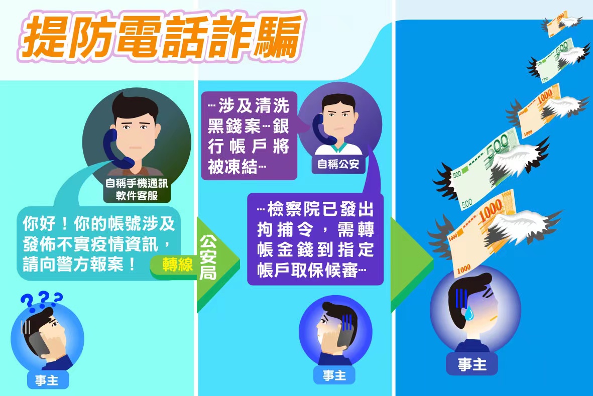 近日,司警局接獲不少市民來電舉報指懷疑接到詐騙電話,對方以普通話自稱為某手機通訊軟件客服人員,指事主的手機帳號涉及發佈與疫情有關的不實消息,並將電話轉接至自稱“公安”之人員,對方稱事主牽涉金融犯罪,故其銀行帳戶將會被凍結,又指“檢察官”已對事主發出拘捕令,要求事主將存款轉帳至指定“安全帳戶”,以取保候審。眾事主覺得事件可疑,馬上掛線,並向司警局舉報。