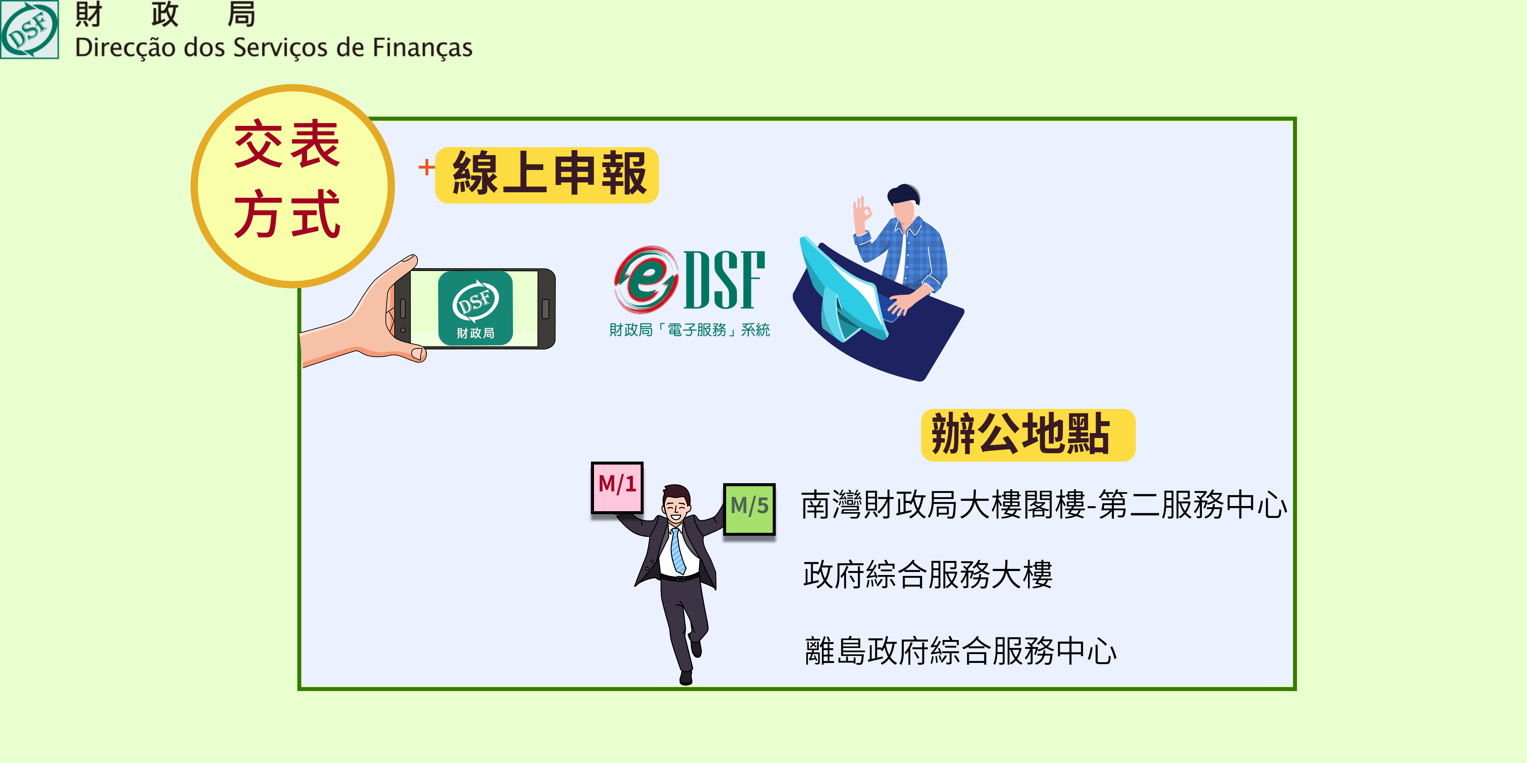 納稅人可於辦公時間內到財政局下列各服務站點遞交表格,由於每年三月份屬遞交稅務表格的高峰期,為免輪候及人群聚集,可先透過“一戶通”移動應用程式的“通用預約及輪候平台”或其網頁版(https://booking.gov.mo)辦理預約交表。納稅人亦可以“一戶通”用戶名稱和密碼登入財政局“電子服務”系統或移動應用程式“MacauTax”,於線上遞交表格。