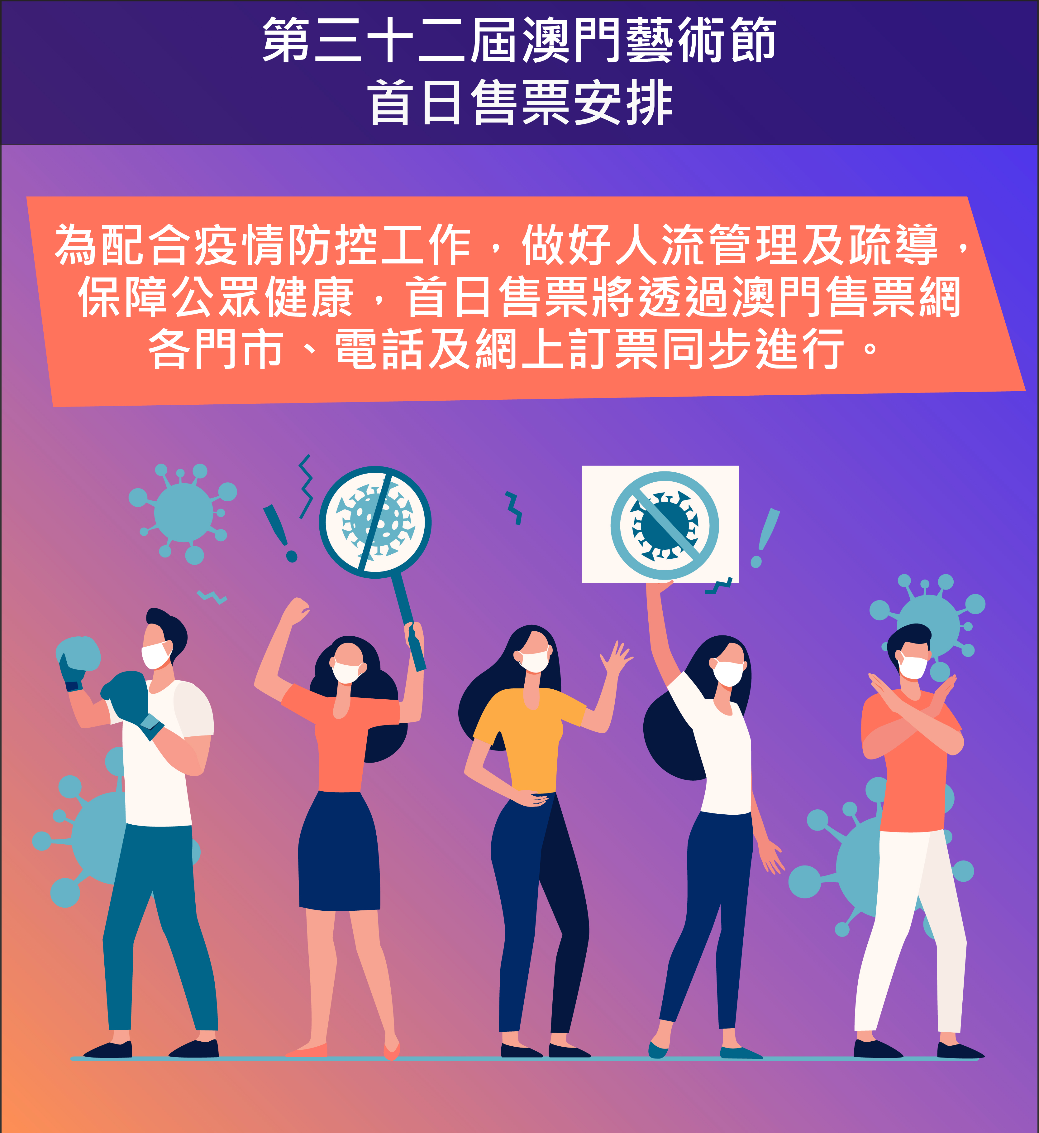 文化局一直嚴謹按照衛生部門相關防疫指引,對藝文活動作出妥善安排,為配合特區政府防疫工作,呼籲市民網上及電話購票,如需於門市購票的市民必須佩戴自備口罩、接受體溫探測,掃描行程記錄的場所二維碼(簡稱場所碼)及出示健康碼,保持適當社交距離,並配合有關防疫及現場的人流措施安排。有關澳門藝術節的資訊可瀏覽藝術節網站(www.icm.gov.mo/fam)、臉書專頁(搜尋“澳門藝術節”)以及訂閱“澳門文化局IC”微信公眾帳號。