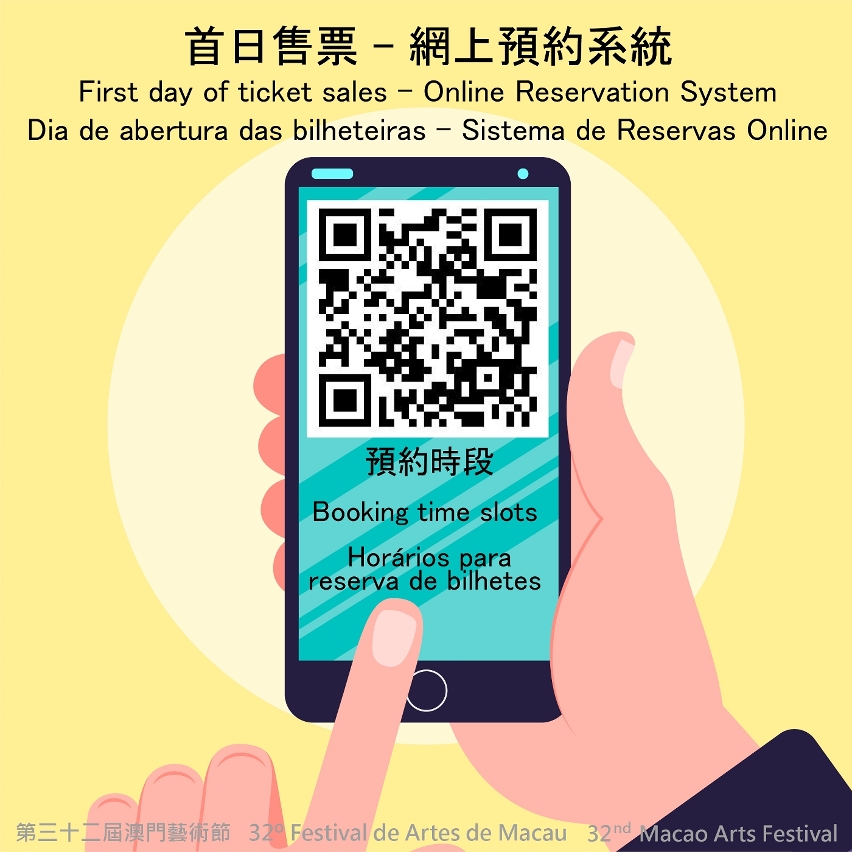 由文化局主辦的第三十二屆澳門藝術節將於4月29日至6月2日舉行。各場節目門票本周日(4月3日)上午10時起在澳門售票網公開發售,門市、電話及網上訂票服務同步開通。為做好疫情防控工作,減少購票現場輪候人流聚集,保障市民的健康,呼籲市民以網上及電話購票,亦為首日售票需親臨門市購票的市民特設網上預約系統,市民須於3月31日(星期四)上午10時起預先透過系統進行登記及預約購票時段,方可在首日售票上午10時至下午1時親臨澳門售票網門市購票。