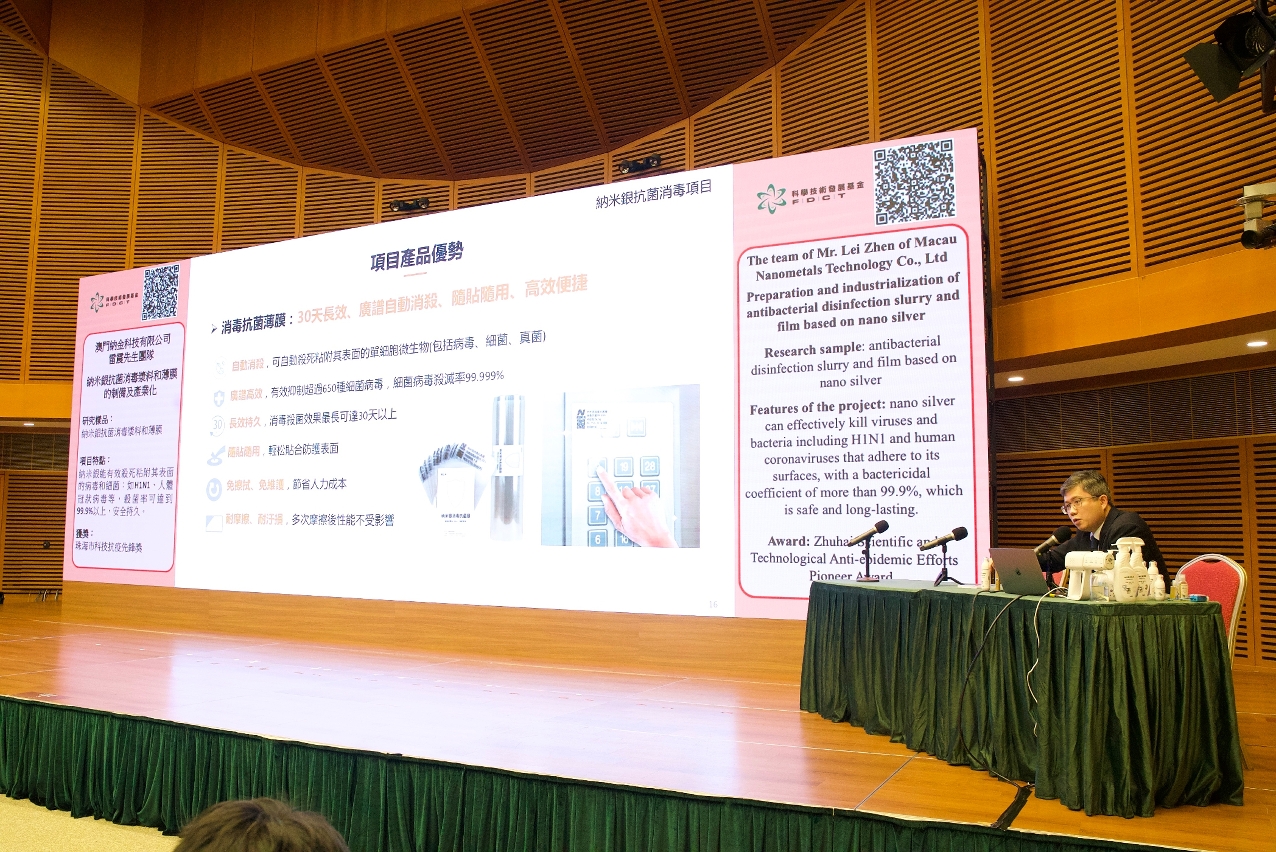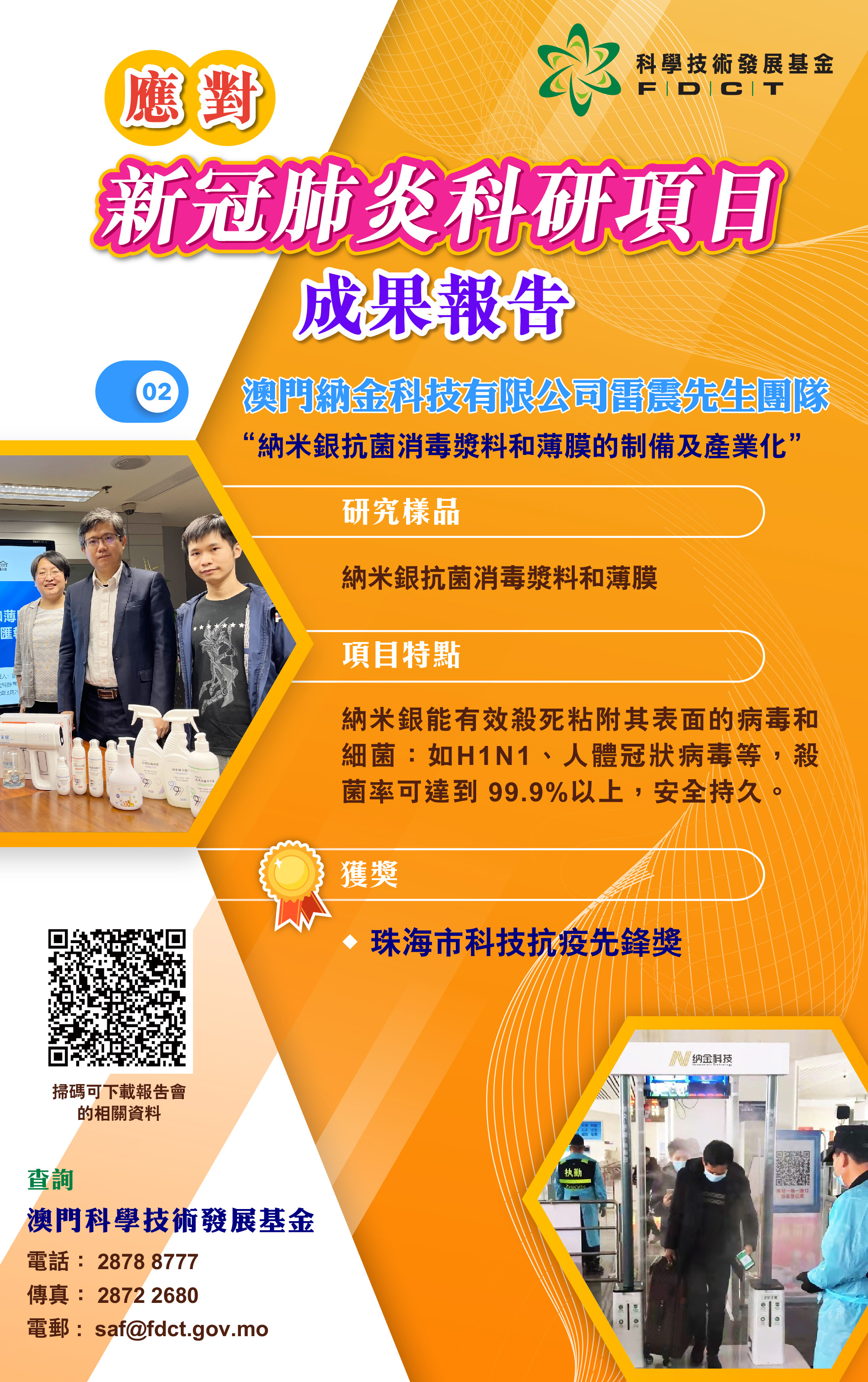 二、澳門納金科技有限公司雷震先生團隊通過 “納米銀抗菌消毒漿料和薄膜的制備及產業化” 項目,研發出納米銀消毒產品,能有效抑制金黃色葡萄球菌、大腸桿菌等650多種單細胞生物,殺死黏附其表面的病毒和細菌等。對甲型流感病毒H1N1、人體冠狀病毒具有很好的抑制並殺滅效果。抗菌膜經水泡30天、暴力摩擦2000次後殺菌效果仍在99.9%以上。產品經檢測為安全不刺激和長效持久,並獲取珠海市科技抗疫先鋒獎。