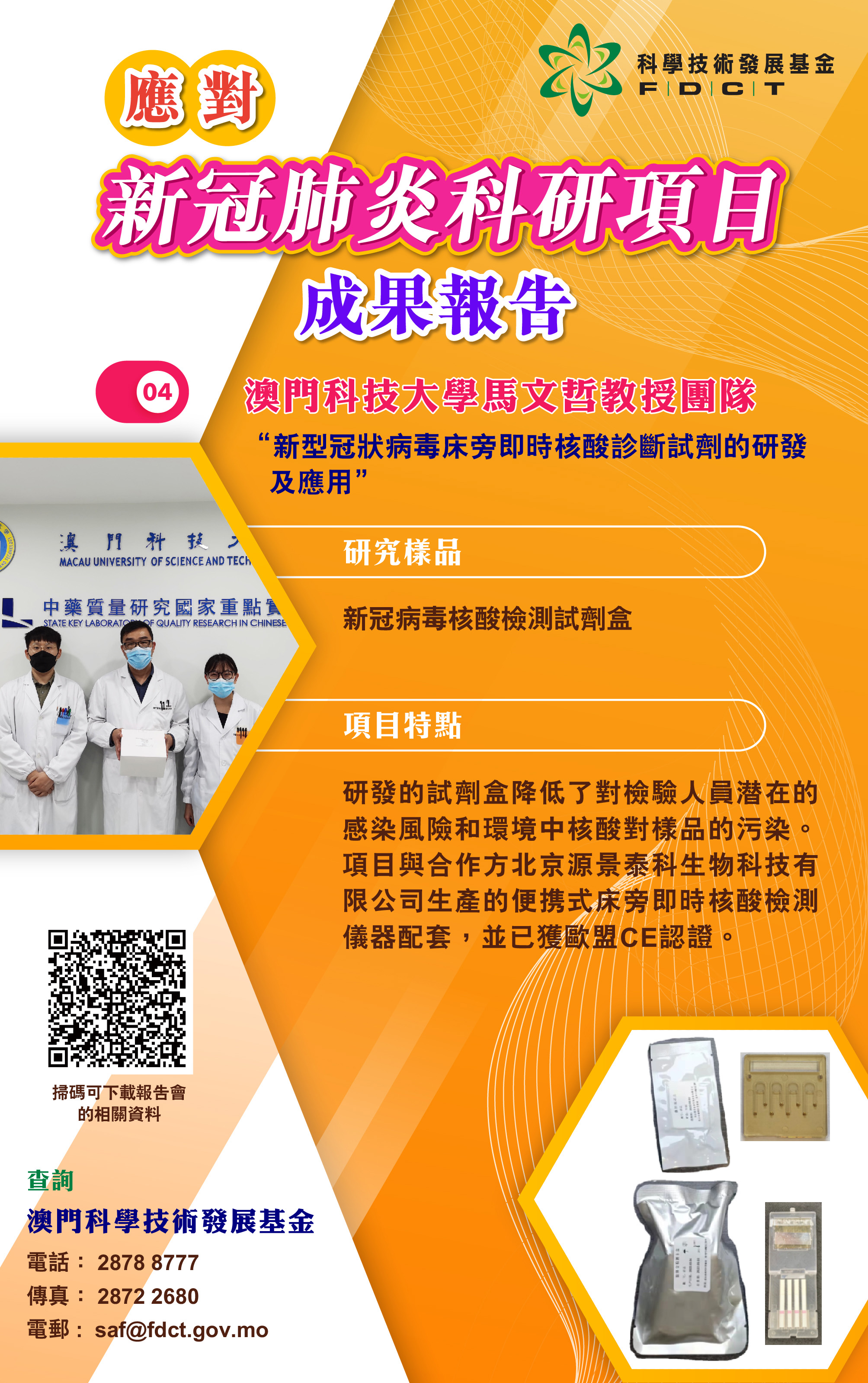 為促進科研成果的應用及向公眾匯報項目的研究成果,科技基金於2022年3月29日下午3時假澳門科學館會議廳舉行「應對新冠肺炎科研項目結題報告會」,邀請來自相關政府部門、本澳大專院校、科技企業、科技社團等代表及公眾出席聽取5個應對新冠肺炎科研項目的研究成果及結題情況。項目由澳門大學、澳門科技大學和澳門納金科技有限公司的科研團隊分別進行匯報,並現場作產品演示。