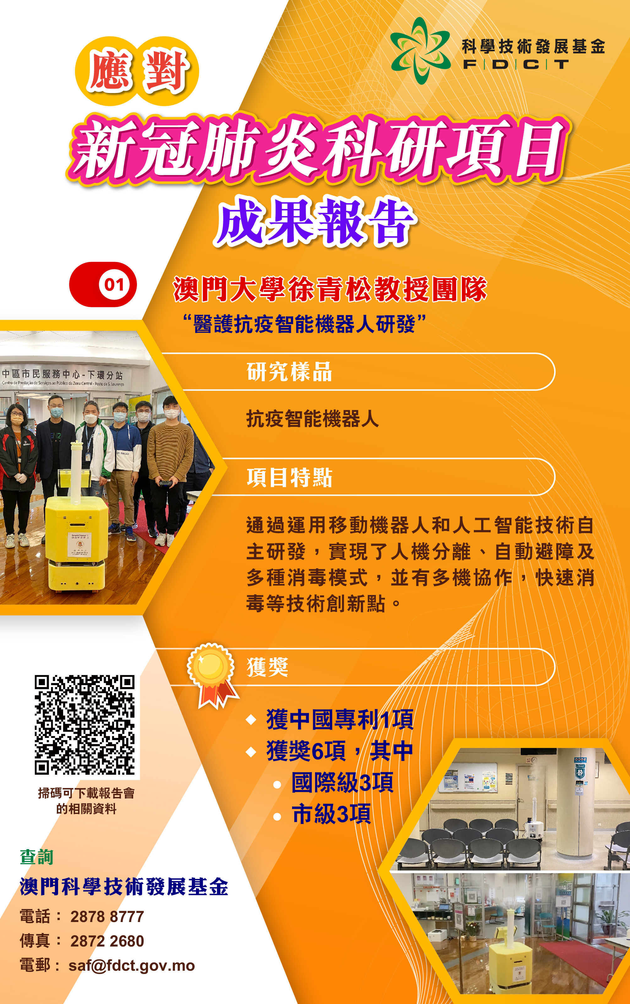 一、澳門大學徐青松教授團隊通過移動機器人和人工智能技術研發的 “醫護抗疫智能機器人”,實現了人機分離、避障功能及多種消毒模式,並以多機協作,快速及定期全方位消毒等技術創新點。消毒機器人已免費爲多個政府部門如市政署,還有為鏡湖醫院及酒店等作為試用場所。目前有多間企業有意實現消毒機器人落地與量產,有助促進澳門及粵港澳大灣區在相關領域的產業化水平。另項目已獲中國專利1項,獲獎6項,其中國際級3項和市級3項。