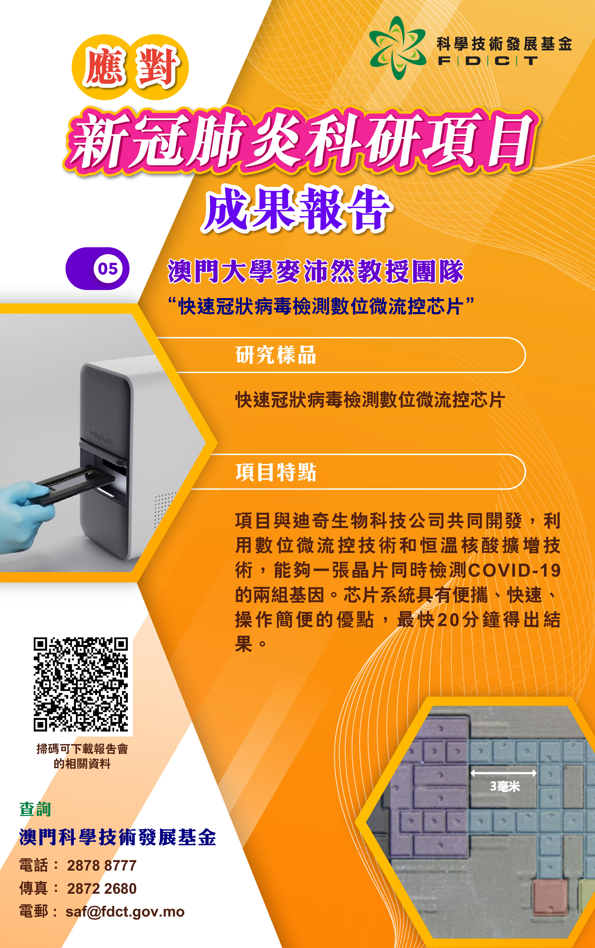 五、澳門大學麥沛然教授團隊的項目“快速冠狀病毒檢測數位微流控芯片”,與迪奇生物科技公司共同開發。項目基於數位微流控技術和恒溫核酸擴增技術,能夠一張晶片同時檢測COVID-19的兩組基因,病毒上樣後最快20分鐘便可得出結果。芯片系統具有便攜、快速、操作簡便的優點。