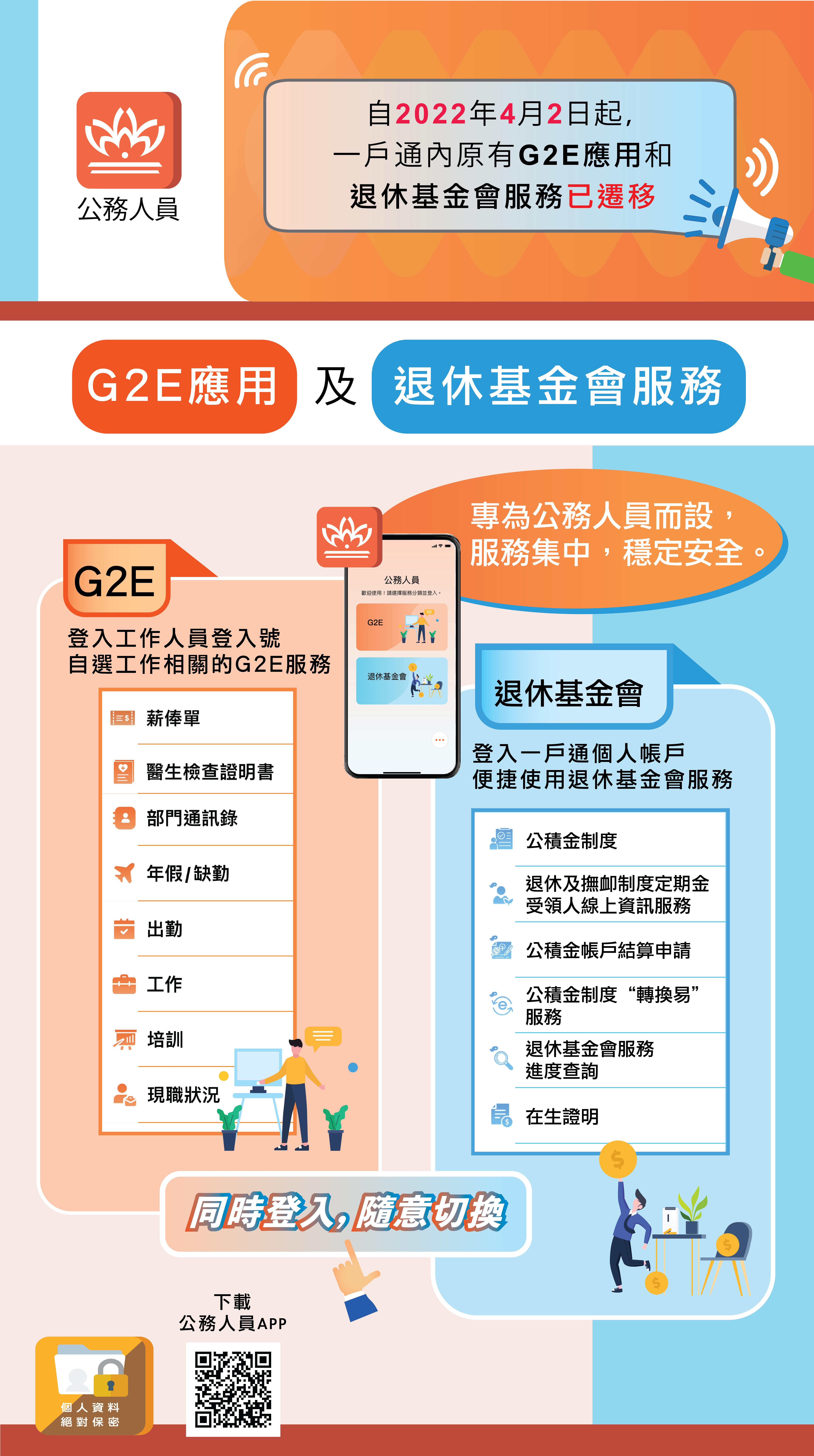 上述“G2E”服務的工作人員帳戶與“退休基金會”“一戶通”個人帳戶可以同時登入,亦可以隨時切換,務求讓公務人員更方便快捷地選用相關電子服務。