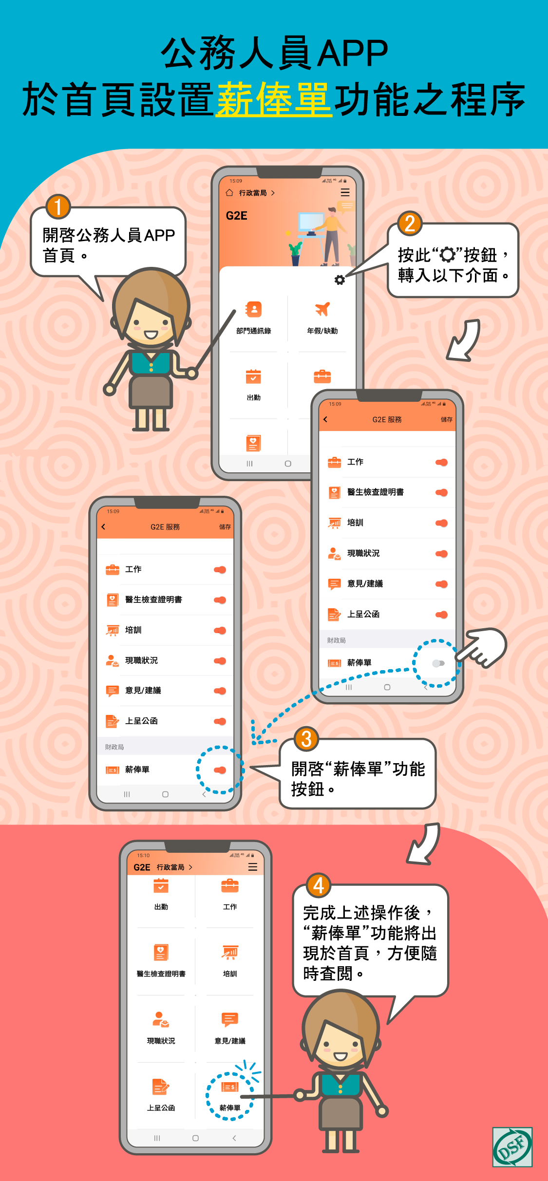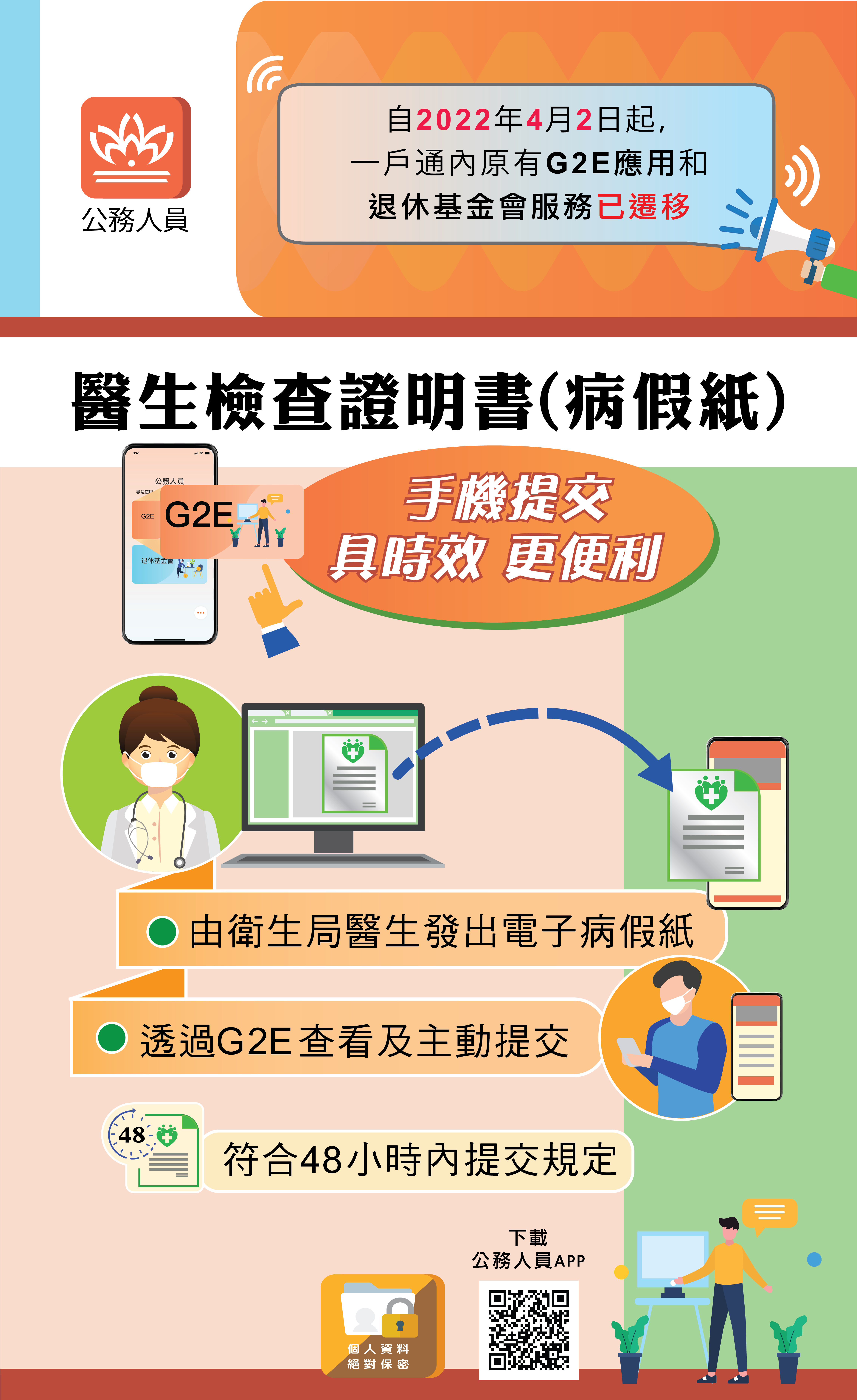 公務人員APP包含“G2E”和“退休基金會”兩大功能類別。公務人員可透過工作人員登入號登入“G2E”,使用原有“G2E”服務,如查看出勤、申請年假或缺勤、報讀培訓課程、公文收發或流轉等。此外,新增遞交醫生檢查證明書(即由衛生局轄下醫院及衛生中心發出的“電子病假紙”)以及查閱電子薪俸單(即財政局發出的“電子糧單”)的功能,操作過程簡便,不受時間和地域限制。其中電子病假紙的推行,尤其便利公務人員在患病休養或照顧患病親屬時,無需工作人員返回所屬部門提交紙本病假紙,功能貼心便捷。