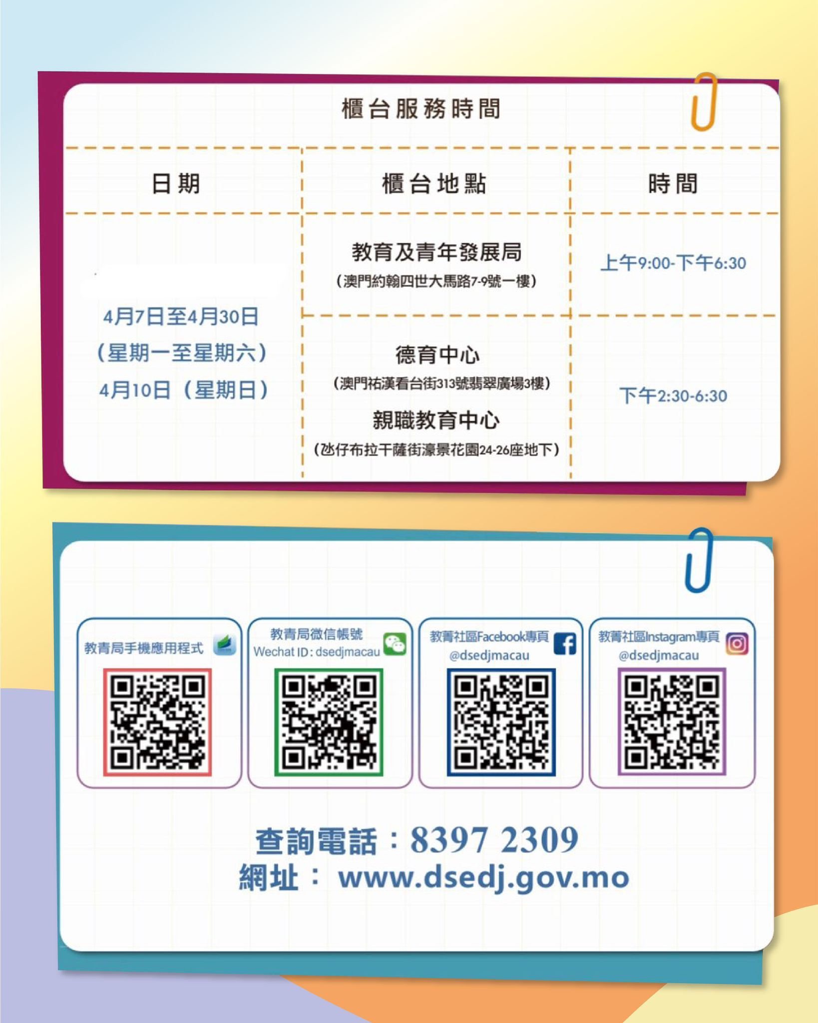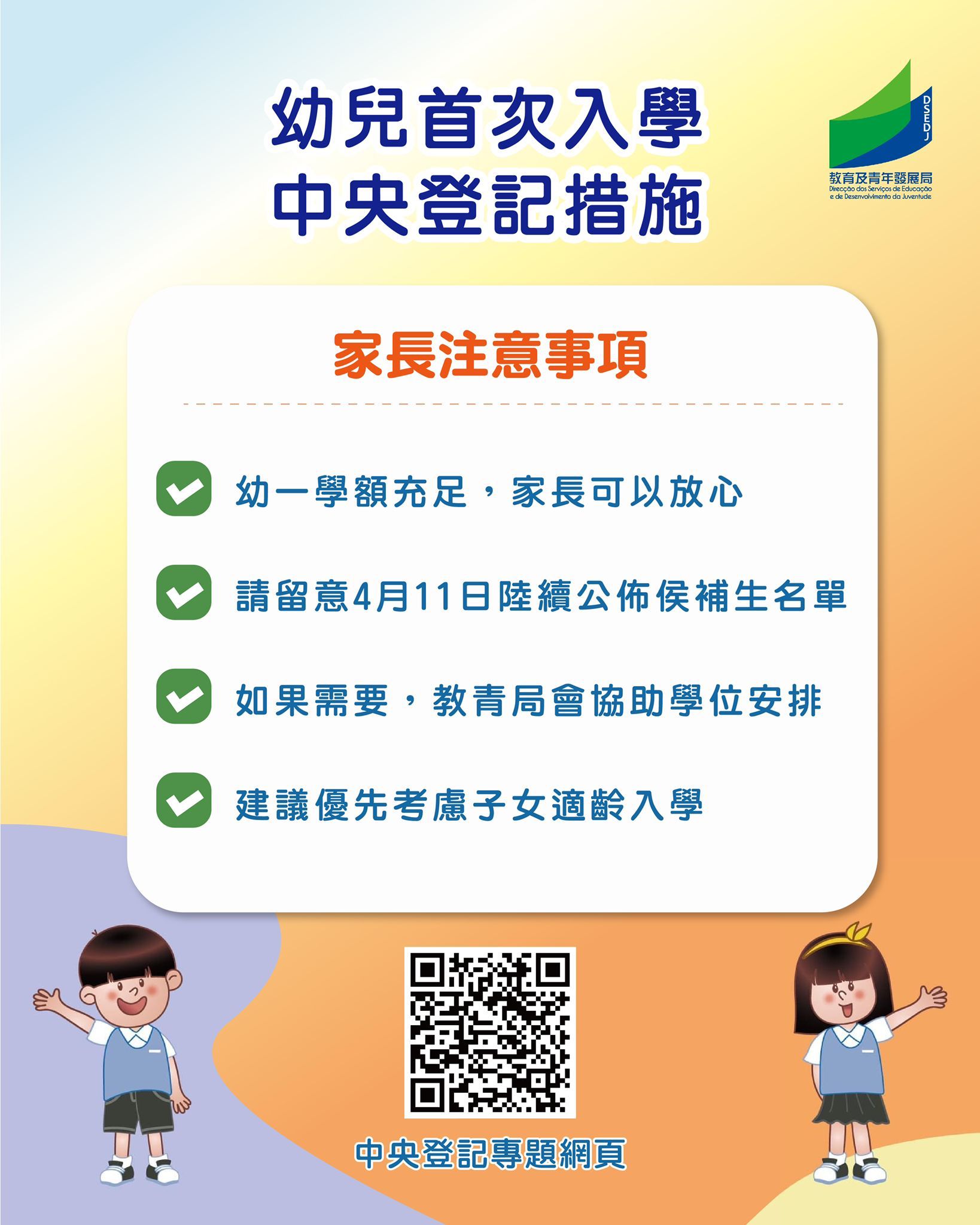 截至4月10日中午一時,已完成網上確認學校的正取生約為88%,教青局提醒仍未網上確認的家長須於今天(4月10日)內在教青局"幼兒首次入學中央登記措施”專題網頁確認入讀一所學校。另外,已網上確認的家長須於4月14日或之前按擬入讀學校通知的日期,前往學校並出示首次入學二維碼或子女的身份證等文件辦理入學手續。若家長擬為子女選讀其他學校,又或子女仍暫未獲學校錄取,家長可於4月19日起在上述專題網頁查詢各校的學位情況,並自行向仍接受報名的學校報讀。如需要協助學位安排,可親臨教青局櫃台申請“學位諮詢及安排服務”;若子女錯過中央登記,家長應在報讀學校前,帶備自己和子女的身份證明文件到上述教青局櫃台辦理幼兒首次入學登記。“幼兒首次入學中央登記措施”查詢電話:8397 2309。倘需要了解更多資訊,請掃瞄二維碼瀏覽教青局專題網頁。
