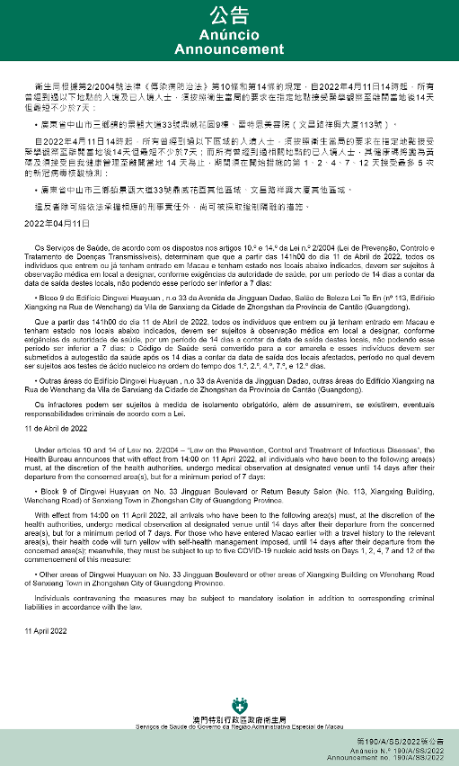 新型冠狀病毒感染應變協調中心(下稱應變協調中心)宣佈,因應內地的疫情變化,衛生局根據第2/2004號法律《傳染病防治法》第10條和第14條的規定,自2022年4月11日下午2時起,所有曾經到過以下地點的入境及已入境人士,須按照衛生當局的要求在指定地點接受醫學觀察至離開當地後14天但最短不少於7天:廣東省中山市三鄉鎮的景觀大道33號鼎威花園9棟、雷特恩美容院(文昌路祥興大廈113號)。
