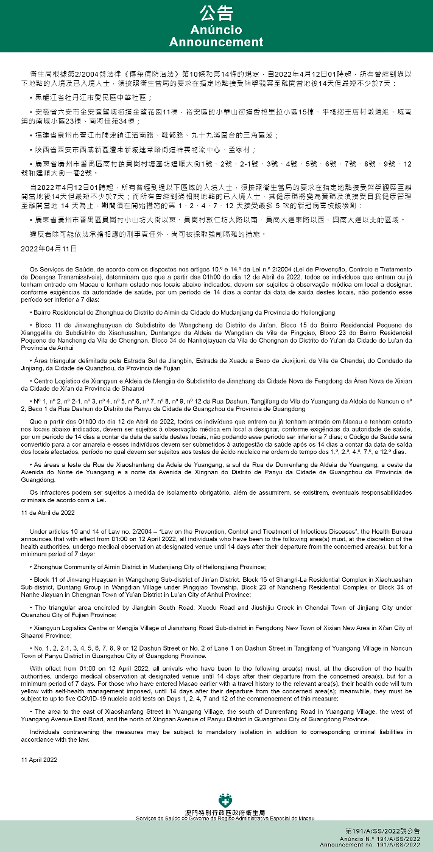 新型冠狀病毒感染應變協調中心(下稱應變協調中心)宣佈,因應內地的疫情變化,衛生局根據第2/2004號法律《傳染病防治法》第10條和第14條的規定,自2022年4月12日凌晨1時起,所有曾經到過以下地點的入境及已入境人士,須按照衛生當局的要求在指定地點接受醫學觀察至離開當地後14天但最短不少於7天:黑龍江省牡丹江市愛民區中華社區;安徽省六安市金安區望城街道金望花園11棟,裕安區的小華山街道香格里拉小區15棟、平橋鄉王店村墩塘組、城南鎮的南城小區23棟、南河佳苑34棟;福建省泉州市晉江市陳埭鎮江濱南路、鞋都路、九十九溪圍合的三角區域;陝西省西安市西鹹新區灃東新城建章路街道的祥雲物流中心、孟家村;廣東省廣州市番禺區南村鎮員崗村塘基坊達順大街1號、2號、2-1號、3號、4號、5號、6號、7號、8號、9號、12號和達順大街一巷2號。