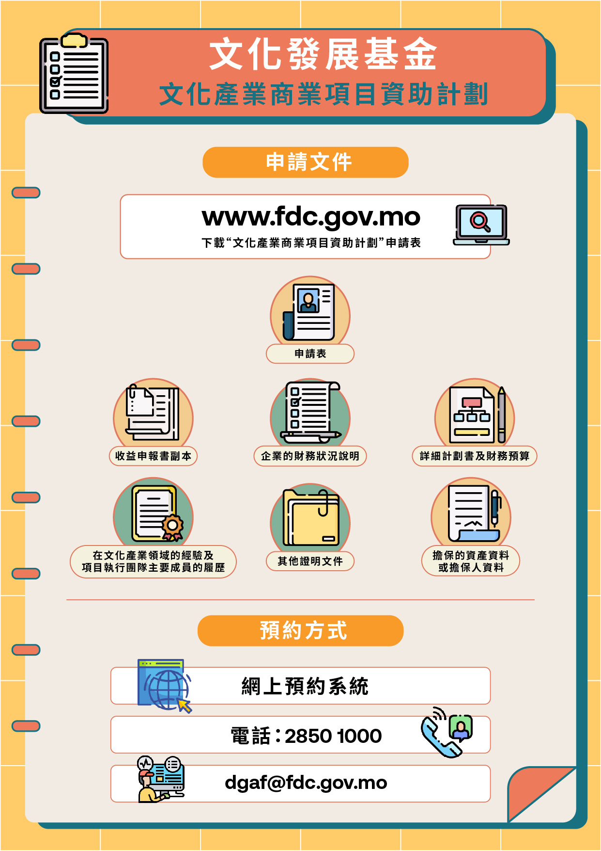 為詳細介紹“文化產業商業項目資助計劃”的申請事宜,文化發展基金將於4月22日下午3時舉行線上講解會及解答申請者問題,有興趣人士請於4月20日下午5時45分前,致電2850 1000或電郵dgaf@fdc.gov.mo向基金報名,基金將於稍後提供登錄鏈結,供參與人士於當天進入講解會線上頻道。