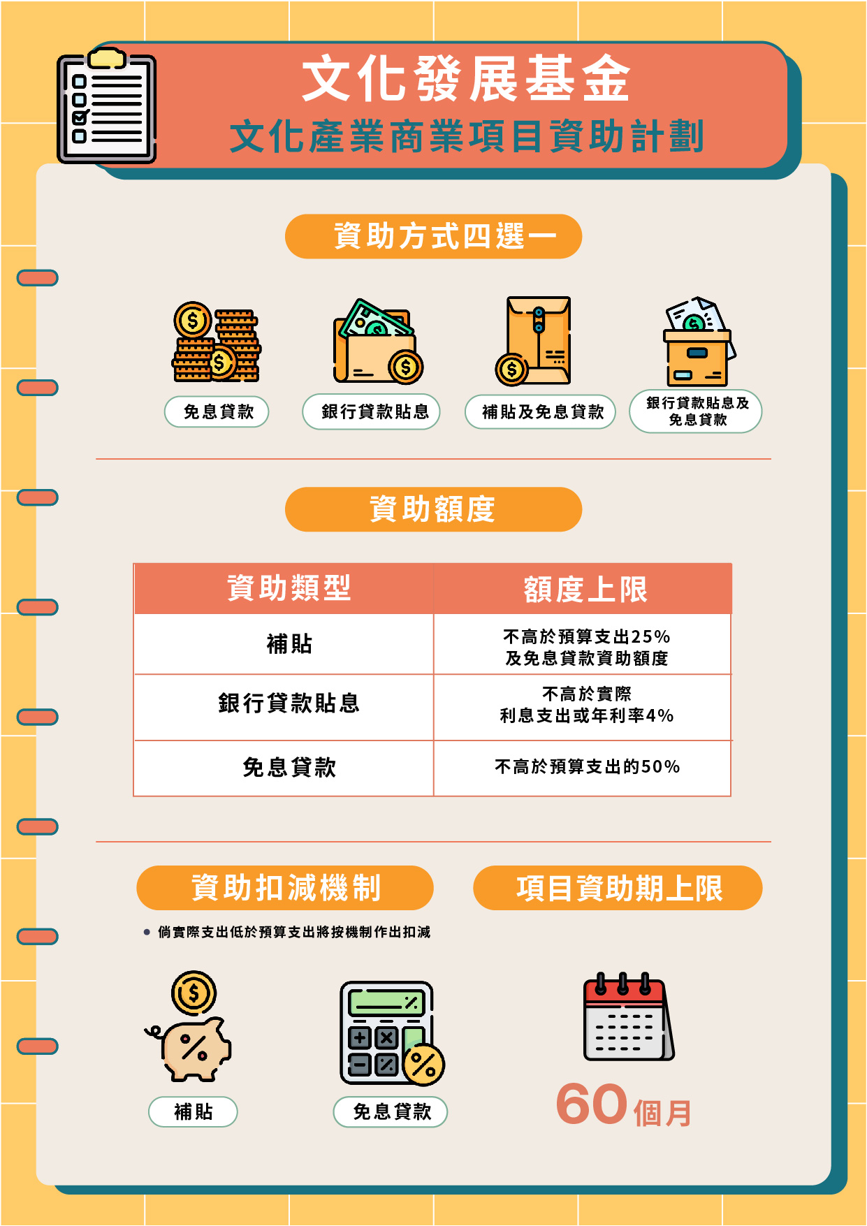 項目的資助期上限為60個月。資助額度方面,補貼、銀行貸款貼息及免息貸款設有不同的批給金額上限,而補貼及免息貸款的批給金額,將因應項目總結時的實際支出作結算,倘實際支出低於申請時的預算支出時,基金將根據機制扣減資助。