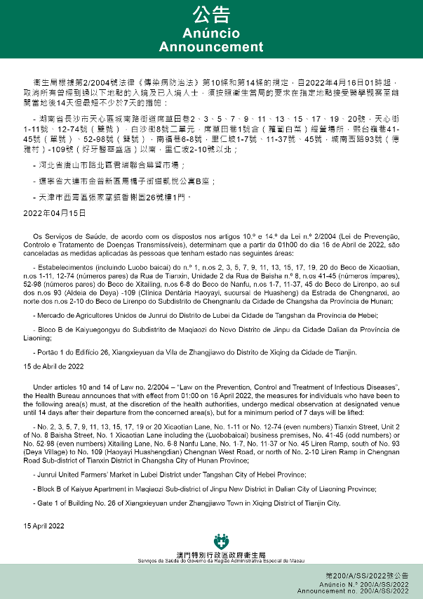 自2022年4月16日凌晨1時起,取消所有曾經到過以下地點的入境及已入境人士,須按照衛生當局的要求在指定地點接受醫學觀察至離開當地後14天但最短不少於7天的措施:湖南省長沙市天心區城南路街道席草田巷2、3、5、7、9、11、13、15、17、19、20號,天心街1-11號、12-74號(雙號),白沙街8號二單元,席草田巷1號含(蘿蔔白菜)經營場所,熙台嶺巷41-45號(單號)、52-98號(雙號),南福巷6-8號,里仁坡1-7號、11-37號、45號,城南西路93號(德雅村)-109號(好牙醫華盛店)以南,里仁坡2-10號以北;河北省唐山市路北區君瑞聯合農貿市場;遼寧省大連市金普新區馬橋子街道凱悅公寓B座;天津市西青區張家窩鎮香榭園26號樓1門。