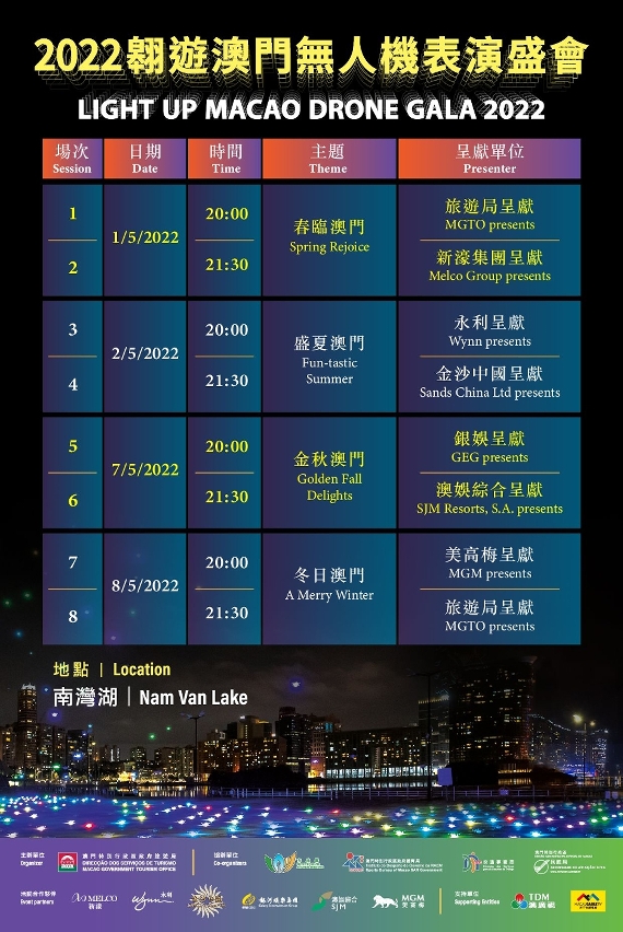 旅遊局將於5月初舉辦“2022翱遊澳門無人機表演盛會”,在勞動節假期(5月1及2日)和接續的週末(7日和8日)四個晚上於南灣湖上演8場精彩表演,歡迎居民和旅客到南灣湖區及雅文湖畔觀賞,共度節日假期。