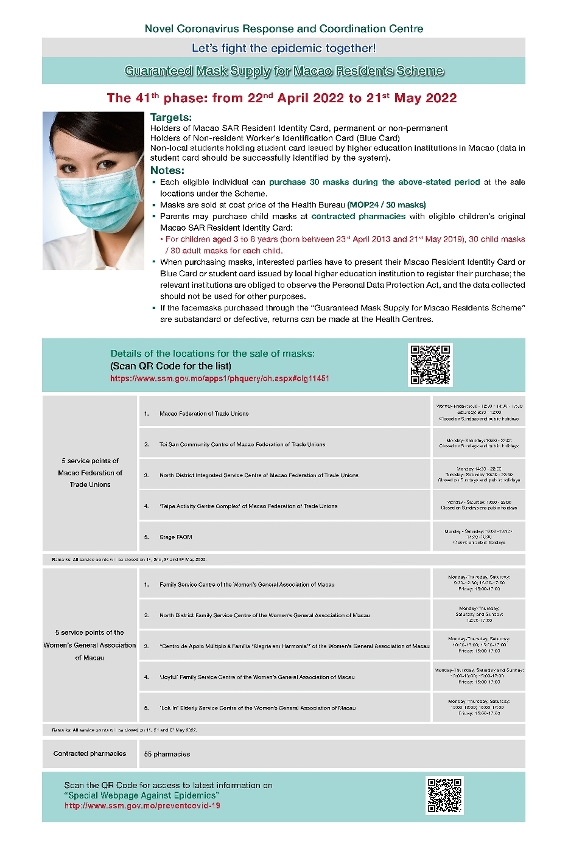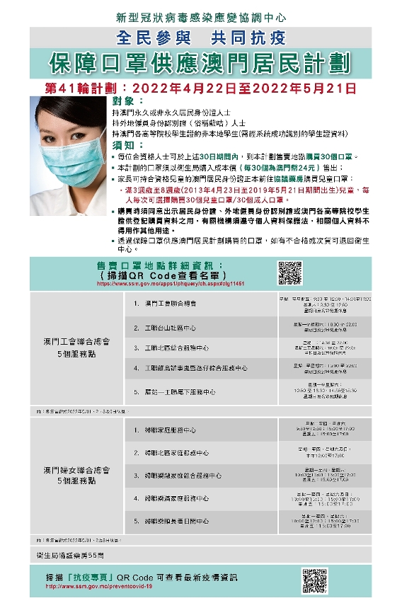 新型冠狀病毒感染應變協調中心今(21)日公佈,第41輪保障口罩供應澳門居民計劃(下稱“口罩計劃”)於明(22)日開始,售賣期間為30日,即2022年4月22日至2022年5月21日,期間每人可一次性購買30個口罩,售價合共24澳門元。衛生局協議藥房、本澳2個社團(工聯、婦聯)繼續提供售賣口罩服務。即全澳共有65個售賣點,服務時間詳見附圖。透過口罩計劃購買的口罩,如有不合格或次貨可退回衛生中心。