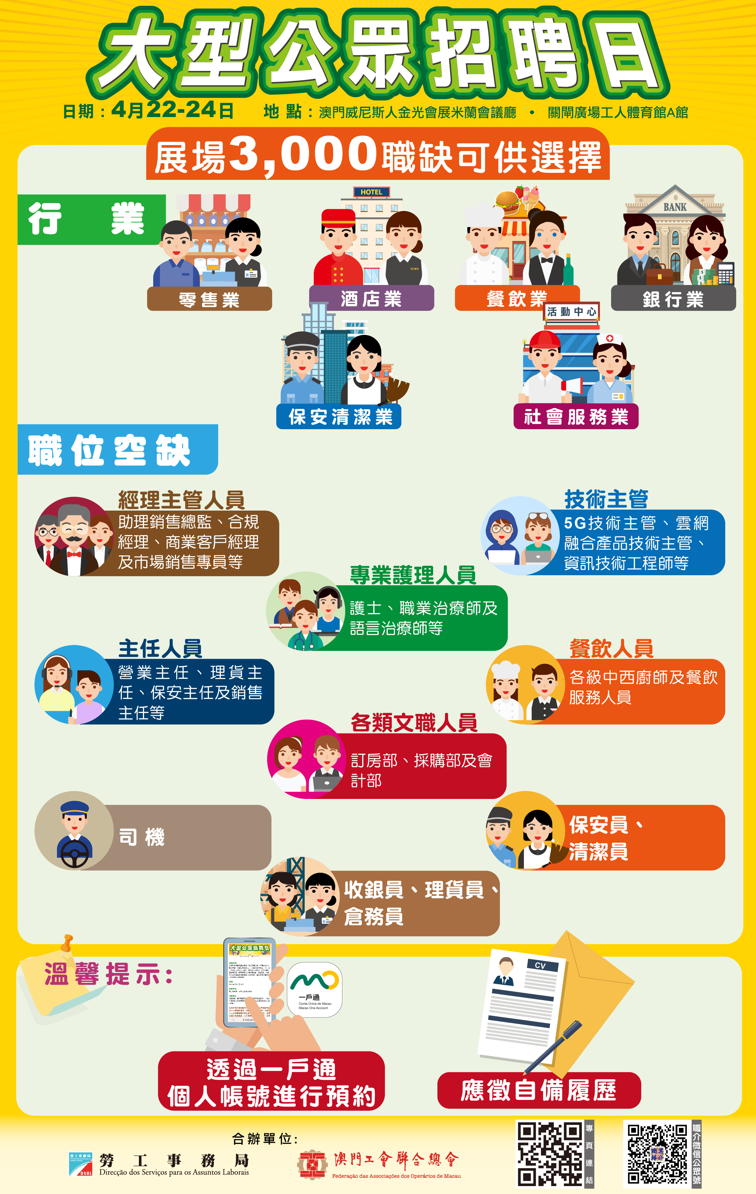 凡入場人士必須嚴格遵守衛生當局的各項防疫措施,包括進場前監測體溫、出示健康碼及掃瞄場所碼、全程佩戴口罩以及與其他參加者保持距離。到場後,請出示二維碼短訊簽到入場,求職者請帶同澳門居民身份證及個人履歷等文件,以便可即場應徵面試。如欲查詢,請於辦公時間內致電28722108 / 28700277。