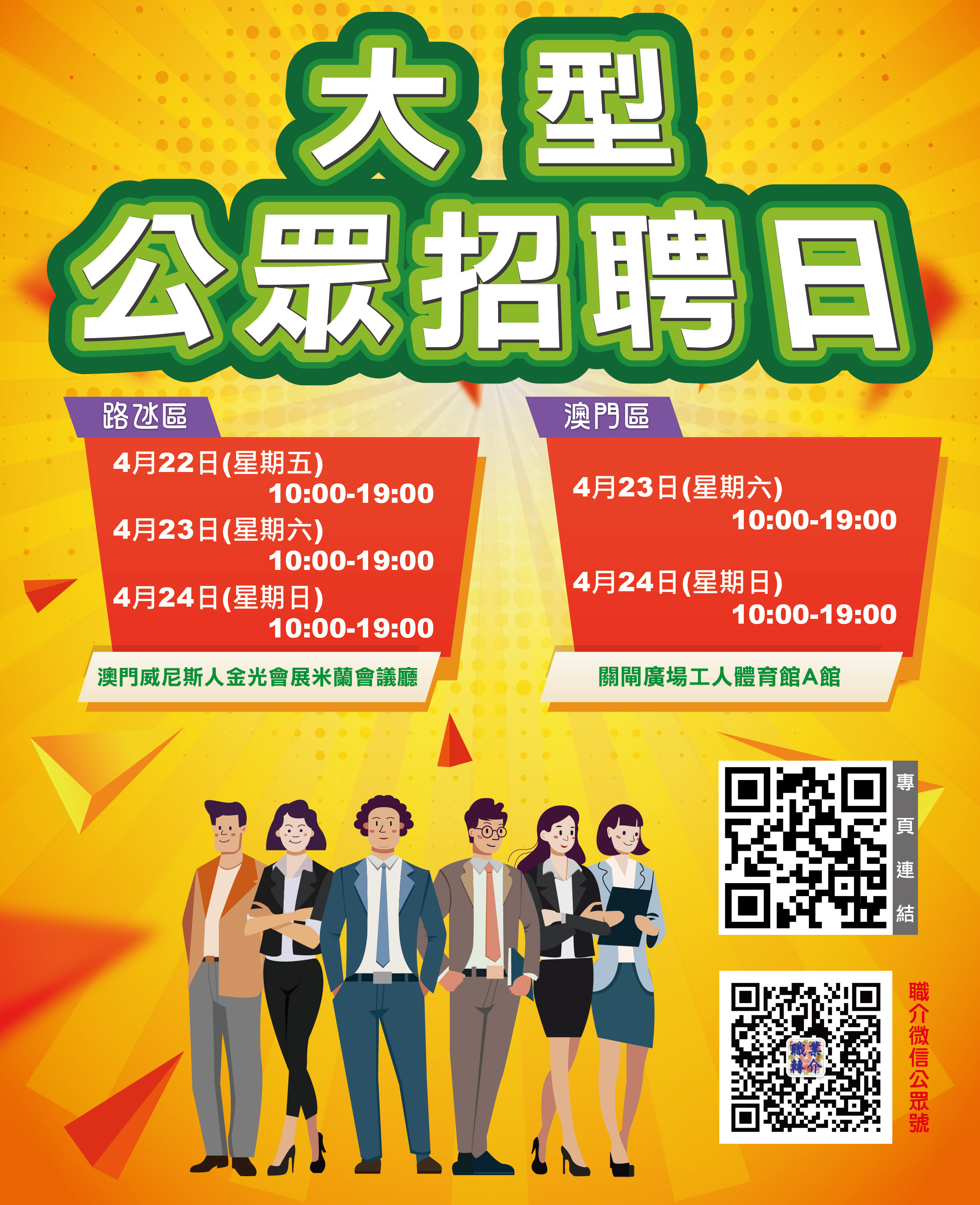 勞工局與工聯總會聯合舉辦「大型公眾招聘日」,22日起一連3日分兩個展場舉行。活動首日(22日)先於威尼斯人金光會展米蘭會議廳舉行,其後兩日(23日及24日)會增加關閘工人體育館展區,提供超過3,000個職位空缺。