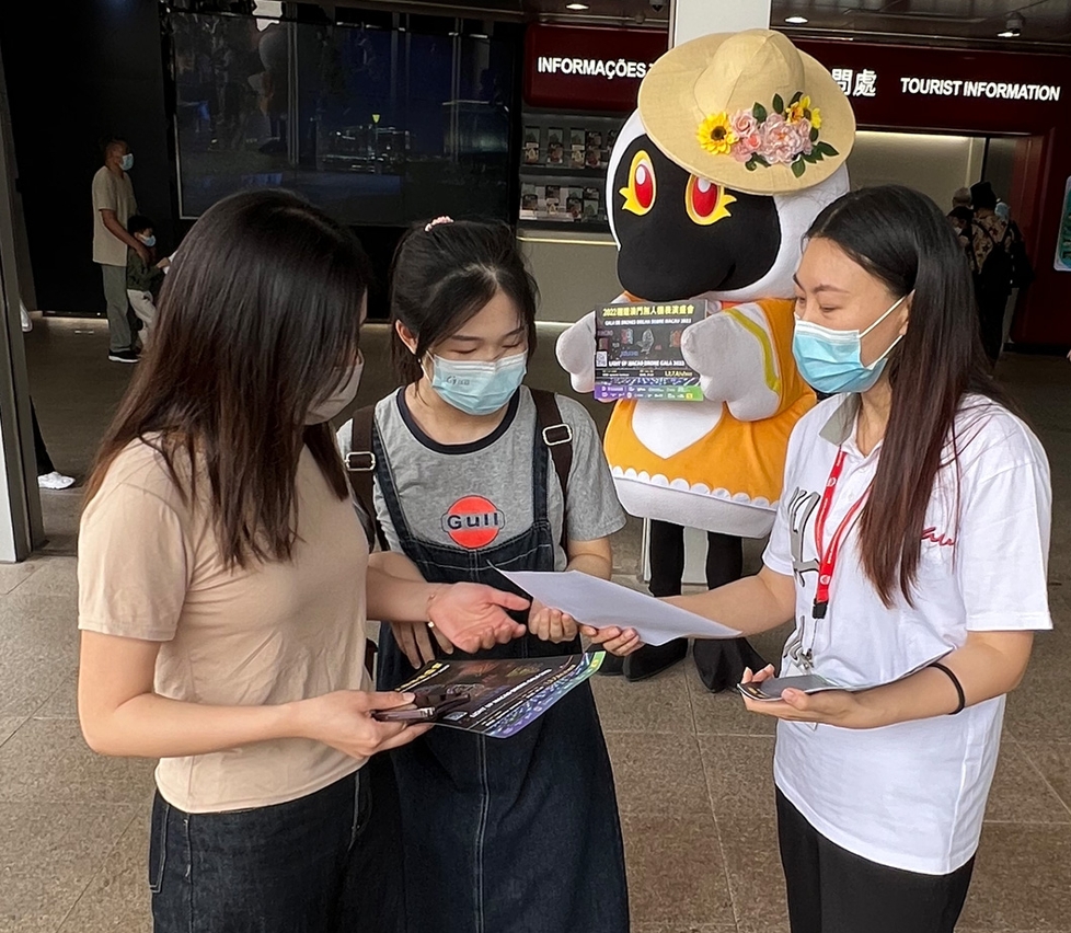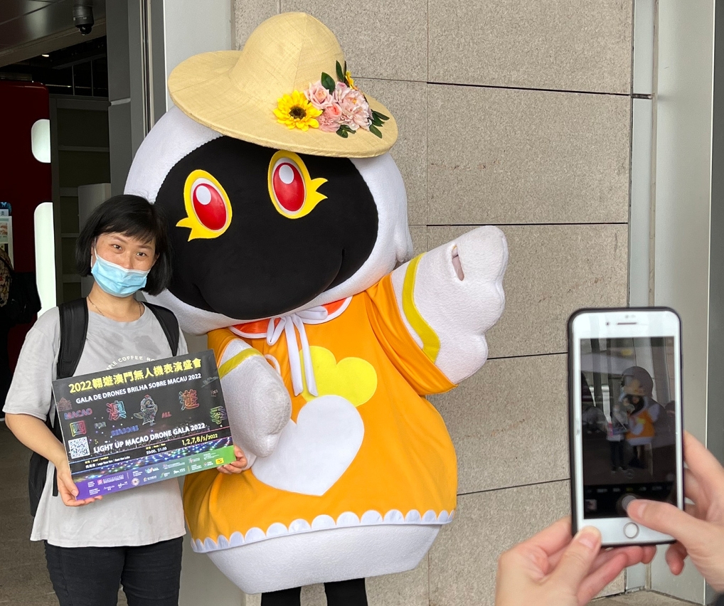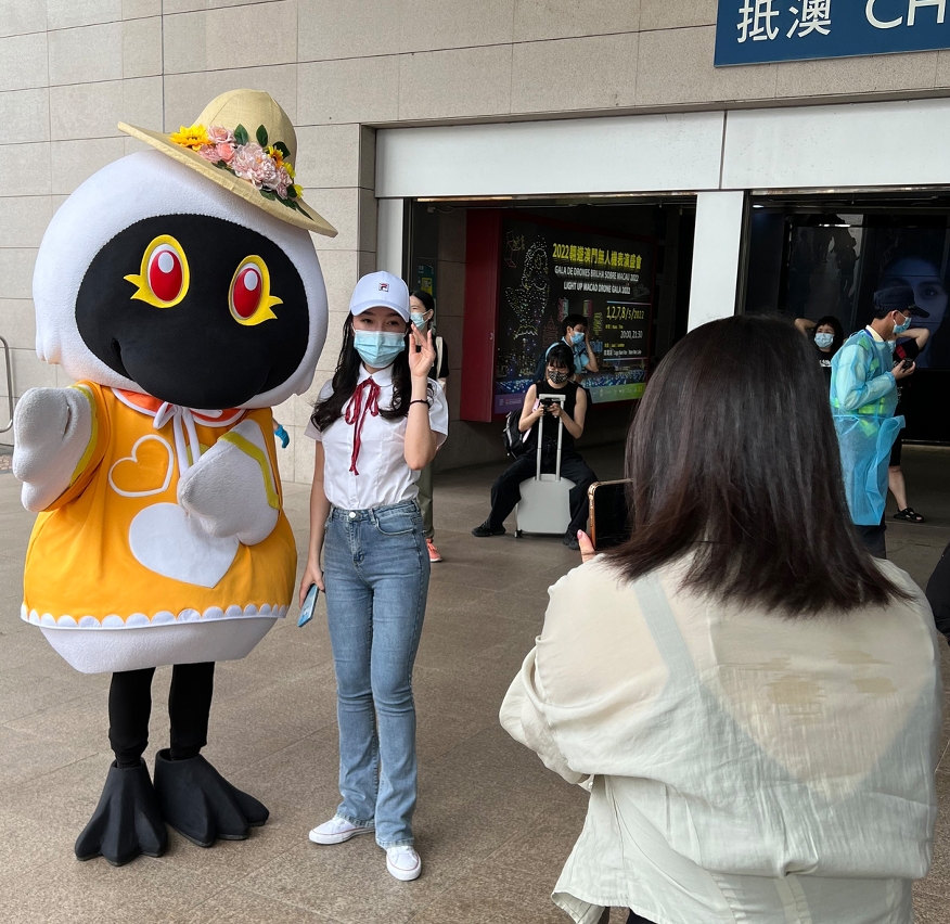 澳門旅遊吉祥物“麥麥”今天親身到關閘口岸歡迎抵澳旅客,向旅客宣傳澳門安全宜遊的信息,以及“五‧一”勞動節期間舉行的“2022翱遊澳門無人機表演盛會”。
