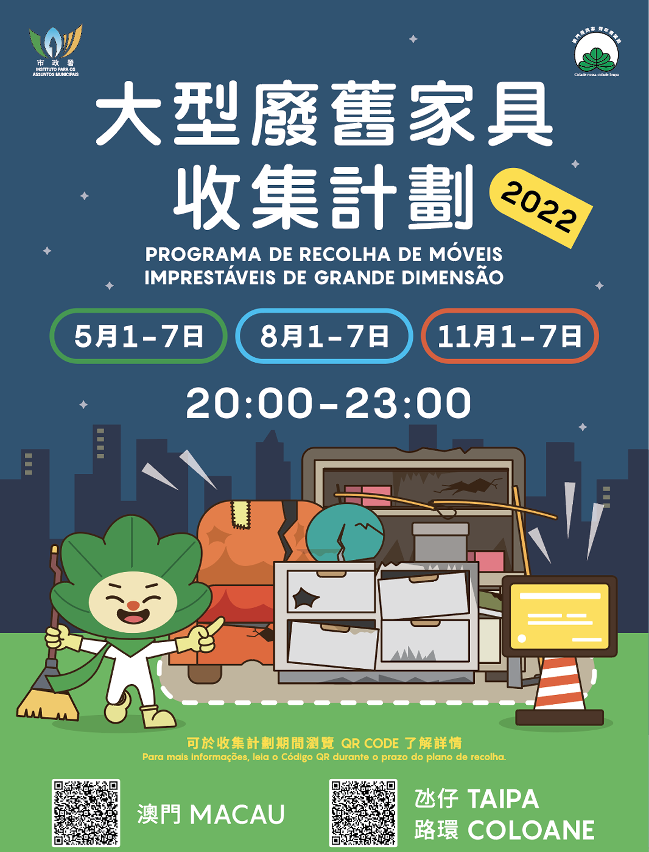 為方便市民棄置大型廢舊家具,市政署將於五月一日至七日晚上八時至十一時,於本澳各區設置六十個臨時大型廢舊家具收集站。當中,澳門半島設有五十個,氹仔及路環則分別設有六個及四個。呼籲市民按指定時間及地點棄置,以免防礙行人及行車安全。