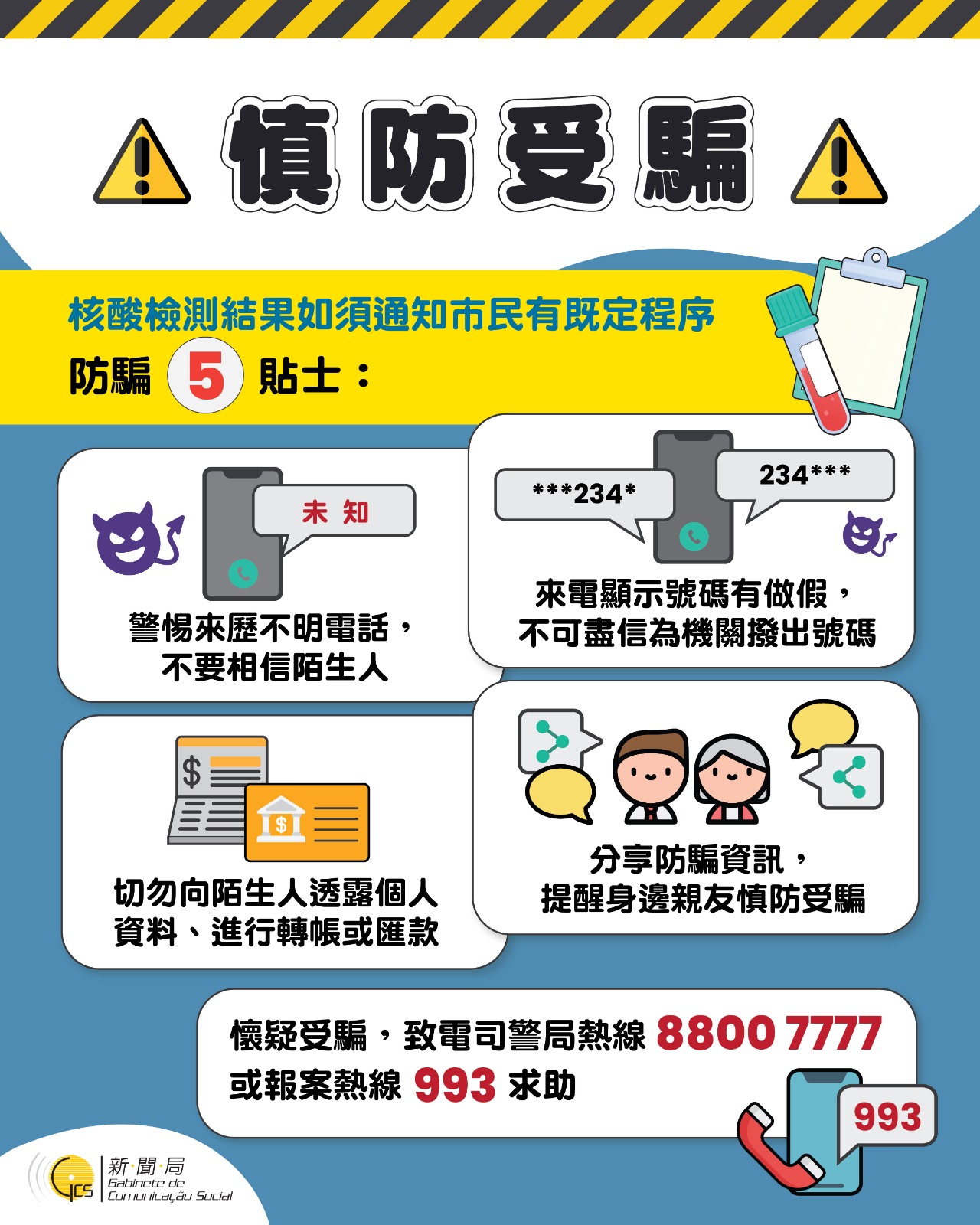 為防止出現冒充醫護人員通知居民核酸檢測結果陽性,藉此騙取個人資料而造成不必要損失的情況, 新型冠狀病毒感染應變協調中心(下稱應變協調中心)表示,雖然本澳暫時未有發生類似事件,但值得注意的是在本澳作核酸檢測結果為陽性時,衛生局有既定程序通知有關人士。