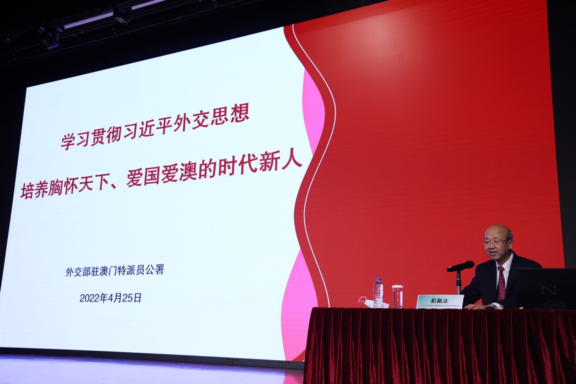 是次講座由中華人民共和國外交部駐澳門特派員公署特派員劉顯法主講,以“學習貫徹習近平外交思想——培養胸懷天下、愛國愛澳的時代新人”為主題,全面而深入地陳述了面對百年變局和世紀疫情,深入分析世界轉型過渡期國際形勢的演變規律。