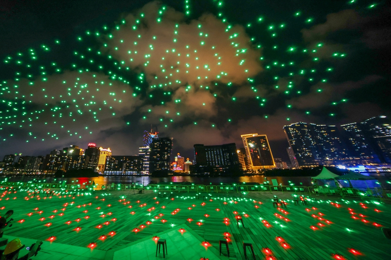 今年無人機表演每場約15分鐘的演出使用880架次無人機,呈現各種圖案,結合燈光和音樂等元素,點亮澳門夜空,為居民及旅客帶來夜間娛樂體驗,深化“旅遊+”跨界融合。