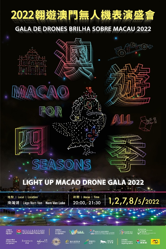 旅遊局舉辦的“2022翱遊澳門無人機表演盛會”將於勞動節假期(5月1及2日)和接續的週末(7日和8日)四個晚上在南灣湖上演8場精彩表演;延伸活動Big Big 無人機展覽和“Drone”愛澳門率先預熱,線上有奬遊戲也已啟動,歡迎居民和旅客參與。
