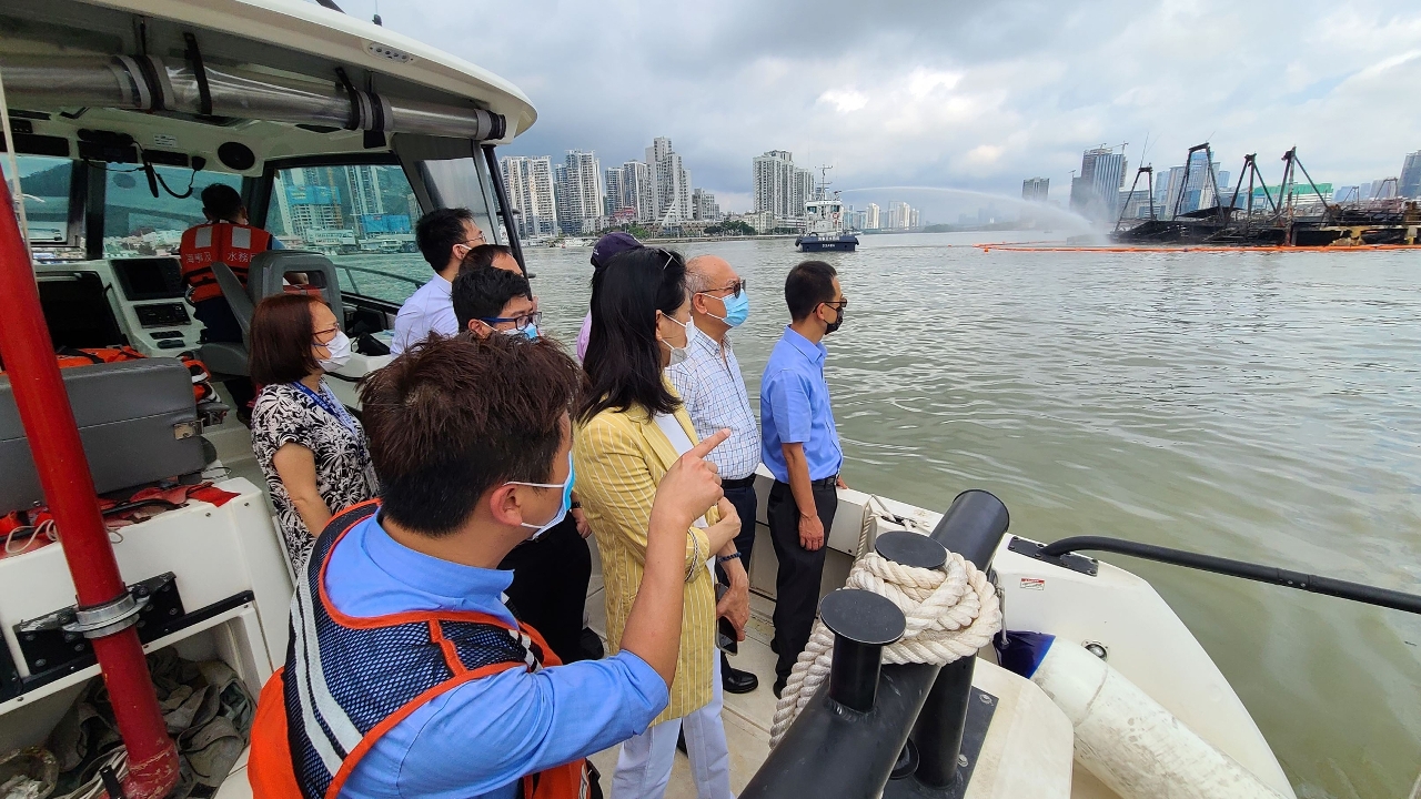 海事及水務局多名相關領導主管人員今早再到漁船火警現場視察,以評估和跟進善後工作。在是次火警中,4艘靠近十六浦的漁船狀況已相對穩定,當中2艘漁船因仍有白煙從船艙內冒出,局方已安排船隻持續向漁船射水,以及在附近作24小時戒備,以便處理突發情況。