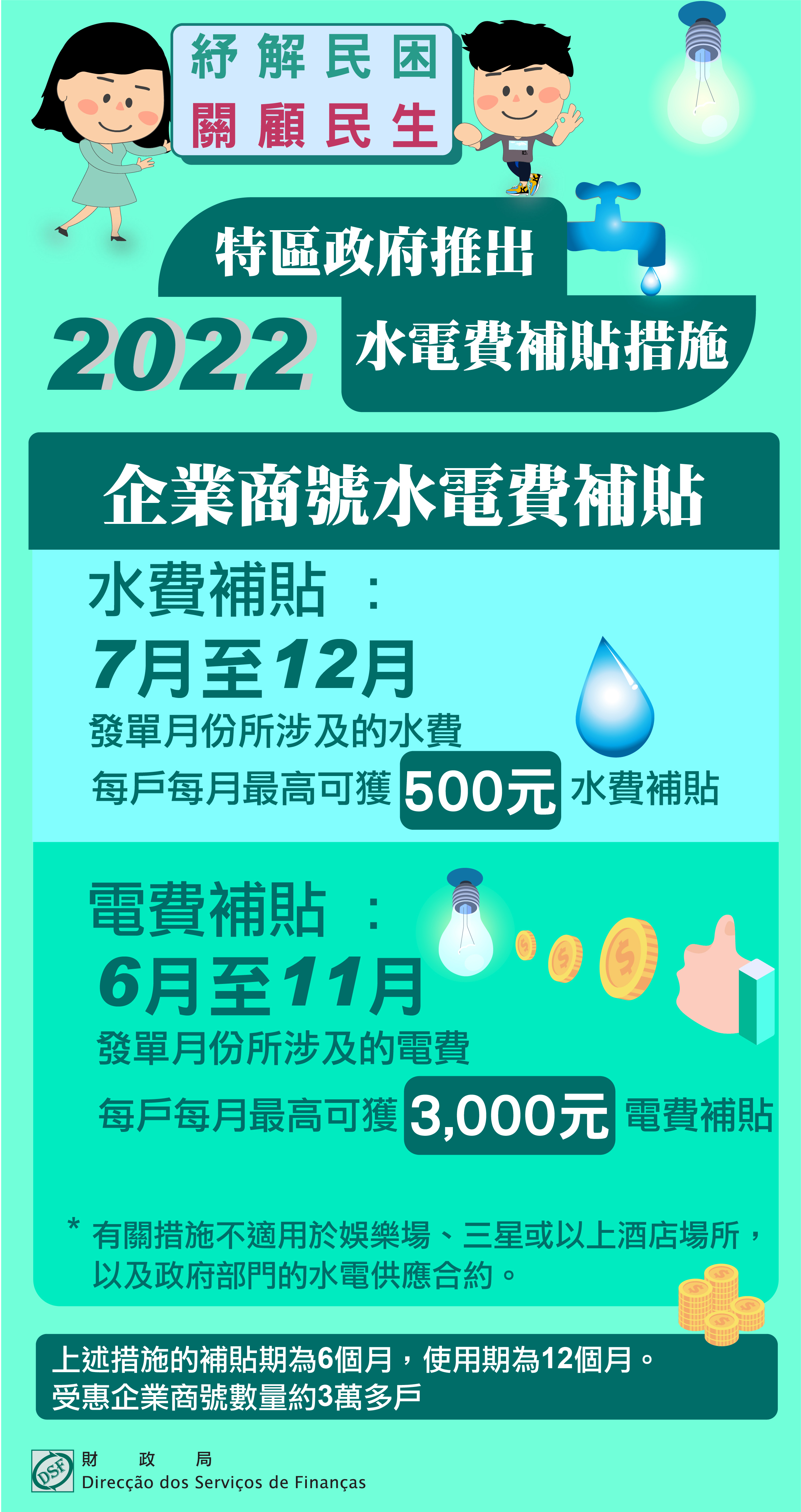 2022家居及企業商號水電費補貼措施的具體實施詳情,澳門自來水股份有限公司及澳門電力股份有限公司將於稍後公佈。