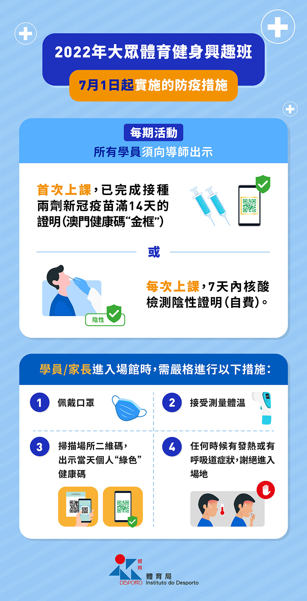 因應疫情防控的需要,體育局大眾體育健身興趣班自7月1日起實施新的防疫措施,所有參與興趣班的學員,須於每期活動(每兩個月為一期)首次上課時,向導師出示已完成接種兩劑新型冠狀病毒疫苗滿14天的證明(澳門健康碼上顯示“金框”圖示)或每次上課時出示7天內核酸檢測陰性證明,有關檢測須自費自行安排。