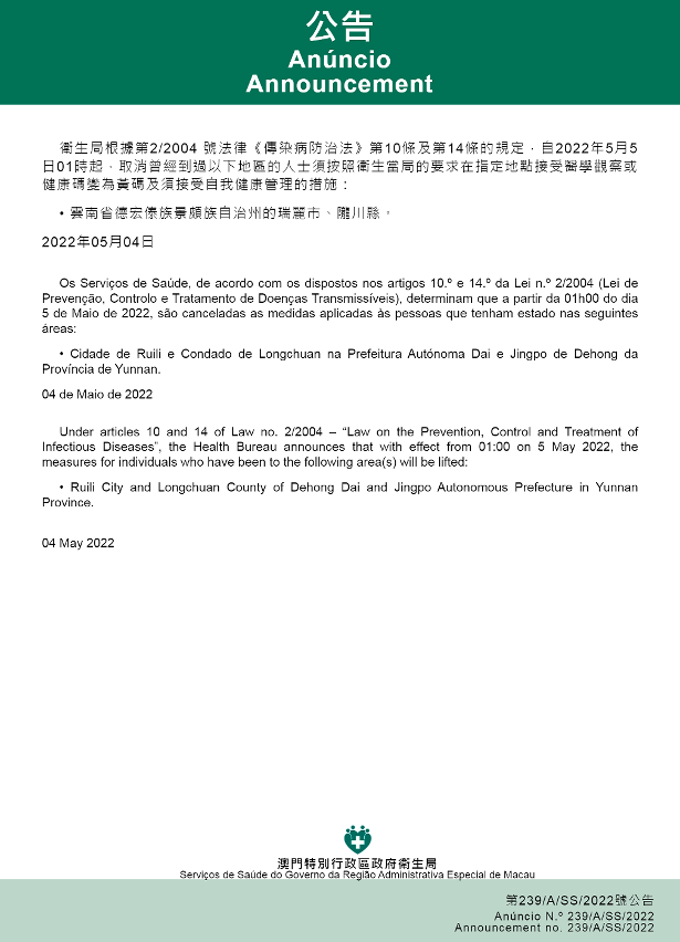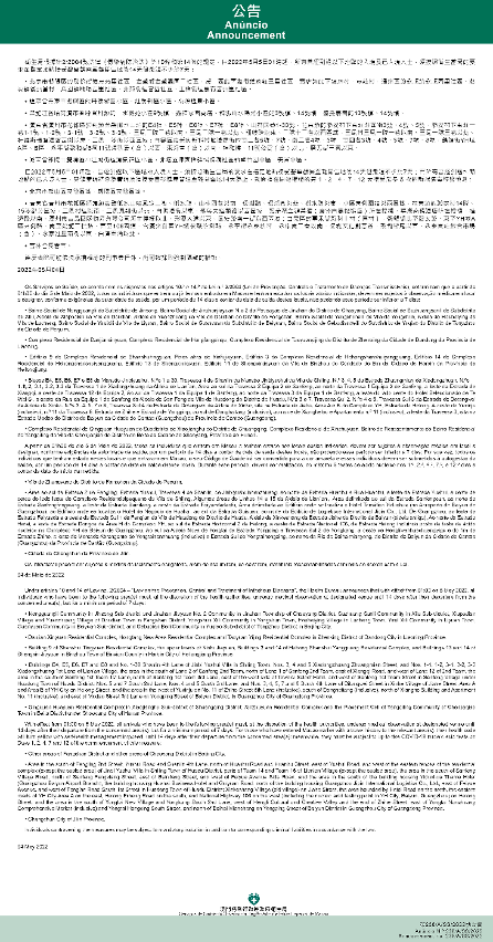 新型冠狀病毒感染應變協調中心(下稱應變協調中心)宣佈,因應內地的疫情變化,衛生局根據第2/2004號法律《傳染病防治法》第10條和第14條的規定,自2022年5月5日凌晨1時起,所有曾經到過以下地點的入境及已入境人士,須按照衛生當局的要求在指定地點接受醫學觀察至離開當地後14天但最短不少於7天: