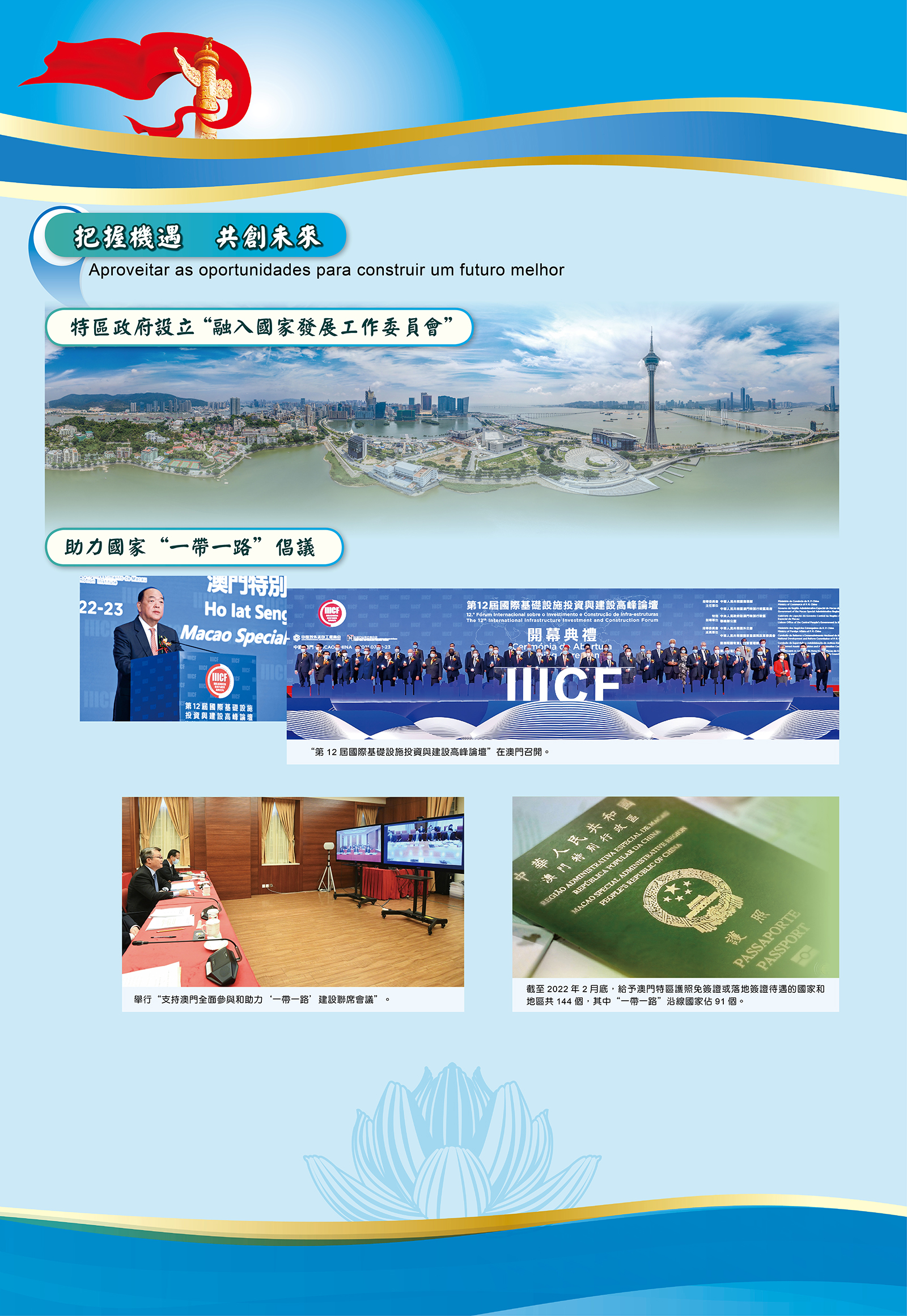 在展覽的此部份內容中闡述了澳門為把握國家發展戰略機遇,實現澳門更好的發展,特區政府於去年設立 “融入國家發展工作委員會”,統籌澳門參與助力國家 “一帶一路” 建設與粵港澳大灣區建設的總體設計及工作部署。特區政府大力推進粵港澳大灣區發展,涵蓋經濟、民生、科研、醫療、法制、交通運輸等方面,其中,青茂口岸於去年開通,更實現了澳門與珠海基礎設施的互聯互通。