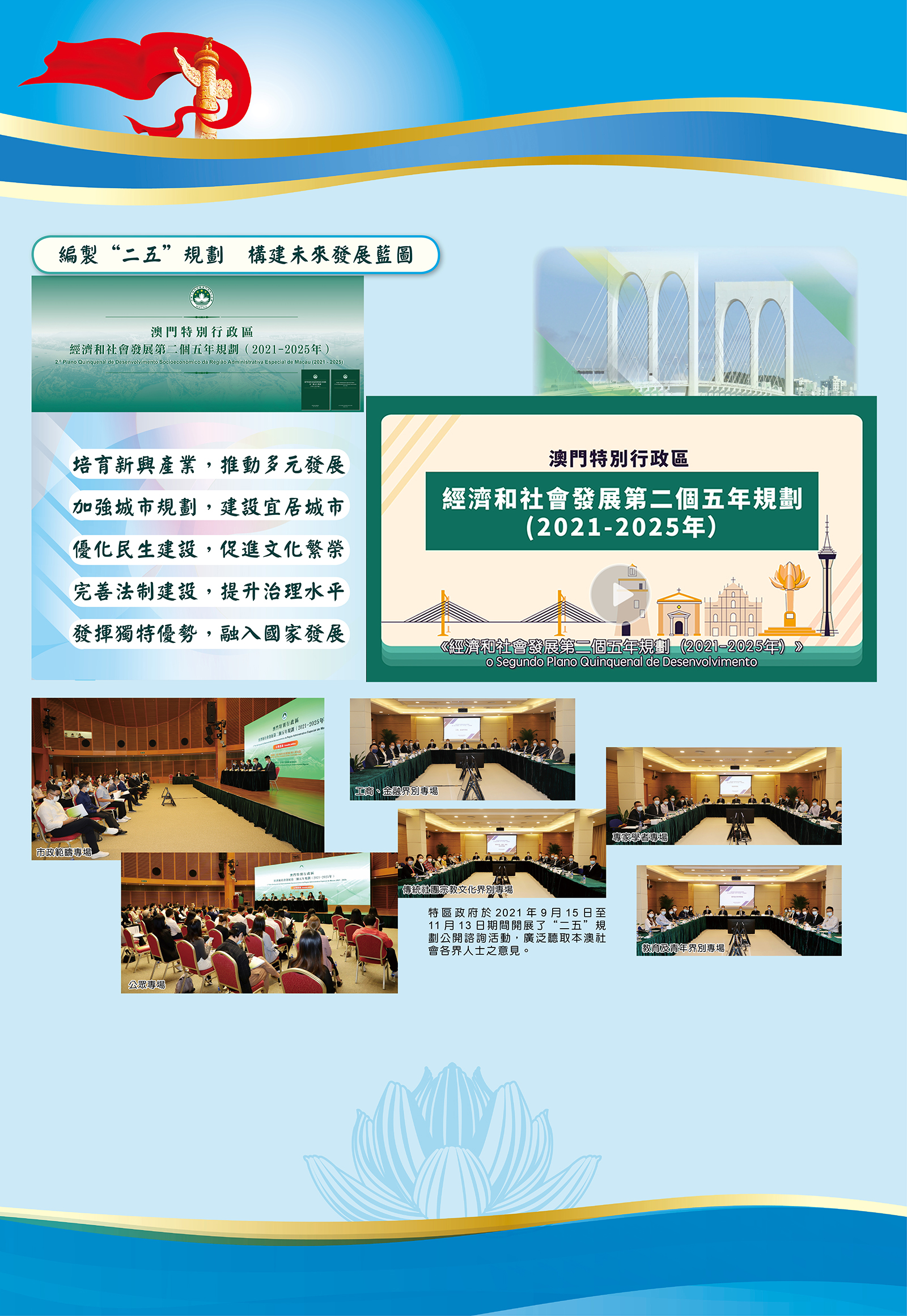 此外,該部份亦分別闡述了行政長官賀一誠於去年多次率團往內地多個城市考察訪問,拓展各省市與澳門的交流合作;為把握國家發展機遇,經廣泛聽取本澳各界人士意見,特區政府編製《澳門特別行政區經濟和社會發展第二個五年規劃(2021-2025年)》,構建未來發展藍圖,為社會提供清晰的發展方向。