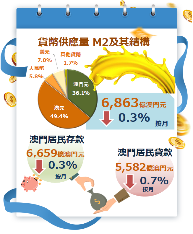 流通貨幣及活期存款分別減少1.5%及1.7%,M1因而較上月下跌1.6%。與此同時,準貨幣負債減少0.1%,因此包括M1及準貨幣負債的廣義貨幣供應量M2遂按月下跌0.3%,金額為6,863億澳門元。若與2021年同期比較,M1及M2分別下跌1.6%及1.9%。按幣種分析,澳門元、港元、人民幣及美元在M2的比重分別為36.1%、49.4%、5.8%及7.0%。