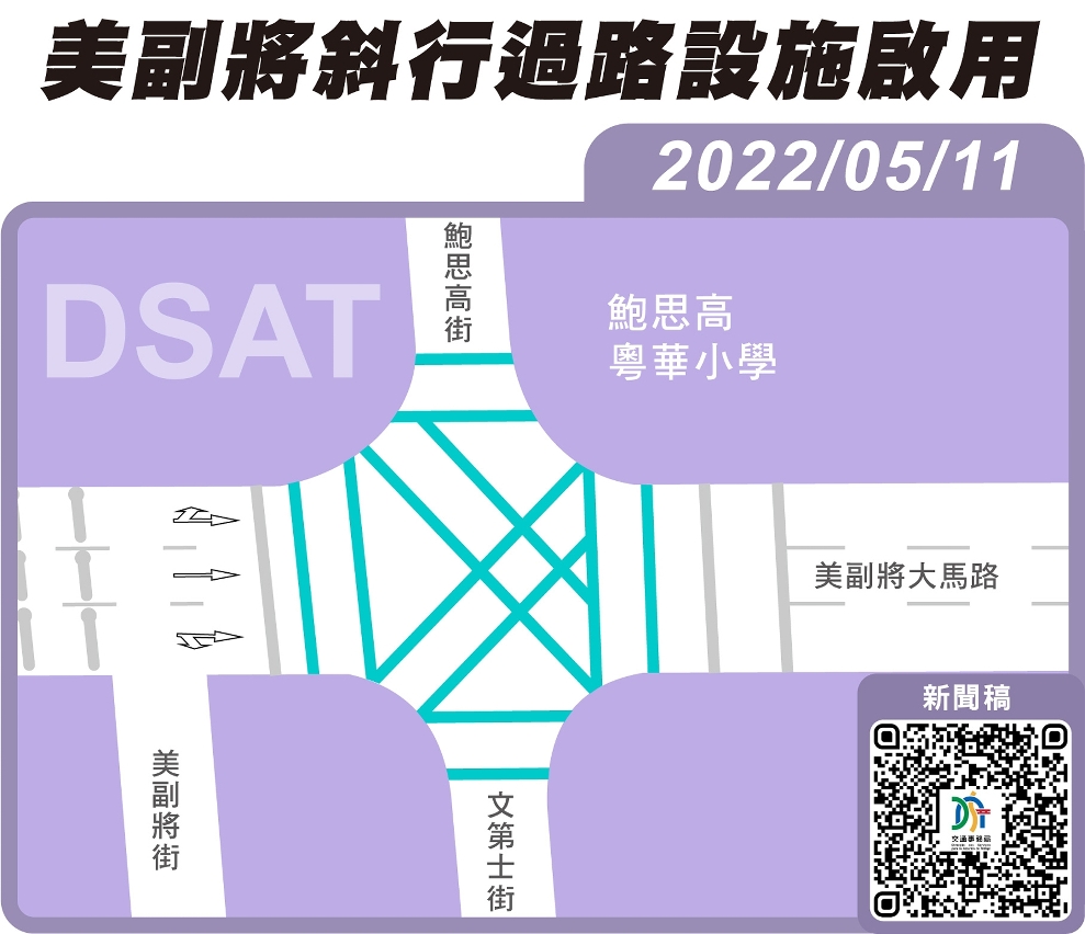 為持續優化本澳行人過路環境,經分析美副將大馬路的道路條件及車輛通行壓力,並聽取周邊學校之意見,交通事務局將於美副將大馬路與鮑思高街及文第士街交界增設斜行式過路設施,並配合美副將大馬路實施的 “智能響應監控(IRC)”交通燈區域配時,進一步方便學童及市民過路。有關設施5月11日(周三)上午完成地面標線及相應配套工作後,正式啟用。