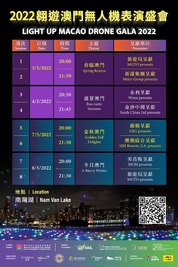 “2022翱遊澳門無人機表演盛會”由旅遊局主辦,四個協辦單位包括:市政署、體育局、交通事務局及民航局,六個活動合作夥伴包括:新濠博亞娛樂、永利、金沙中國、銀河娛樂集團、澳娛綜合度假股份有限公司及美高梅,兩個支持單位包括:澳廣視及澳門有線電視。活動詳情請瀏覽旅遊局網站:https://www.macaotourism.gov.mo/zh-hant/。