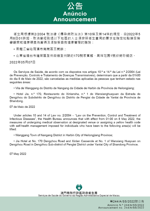 新型冠狀病毒感染應變協調中心(下稱應變協調中心)宣佈,因應內地的疫情變化,衛生局根據第2/2004號法律《傳染病防治法》第10條和第14條的規定,自2022年5月8日凌晨1時起,取消曾經到過以下地區的人士須按照衛生當局的要求在指定地點接受醫學觀察或健康碼變為黃碼及須接受自我健康管理的措施: