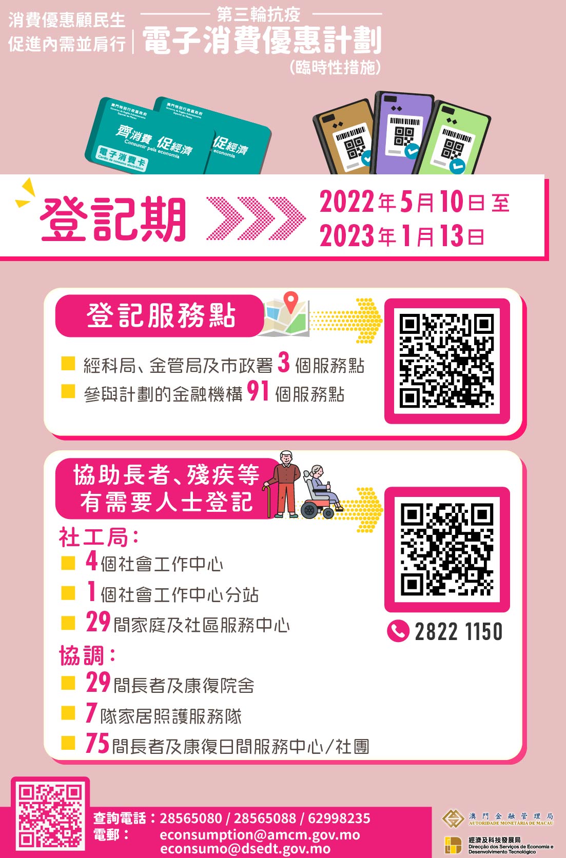 居民可於2022年5月10日早上9時起,至2023年1月13日期間,到金管局網頁( https://registration.amcm.gov.mo/econsumption/terms_zh.html ),登記以“實名認證的移動支付”或“電子消費卡”領取優惠。