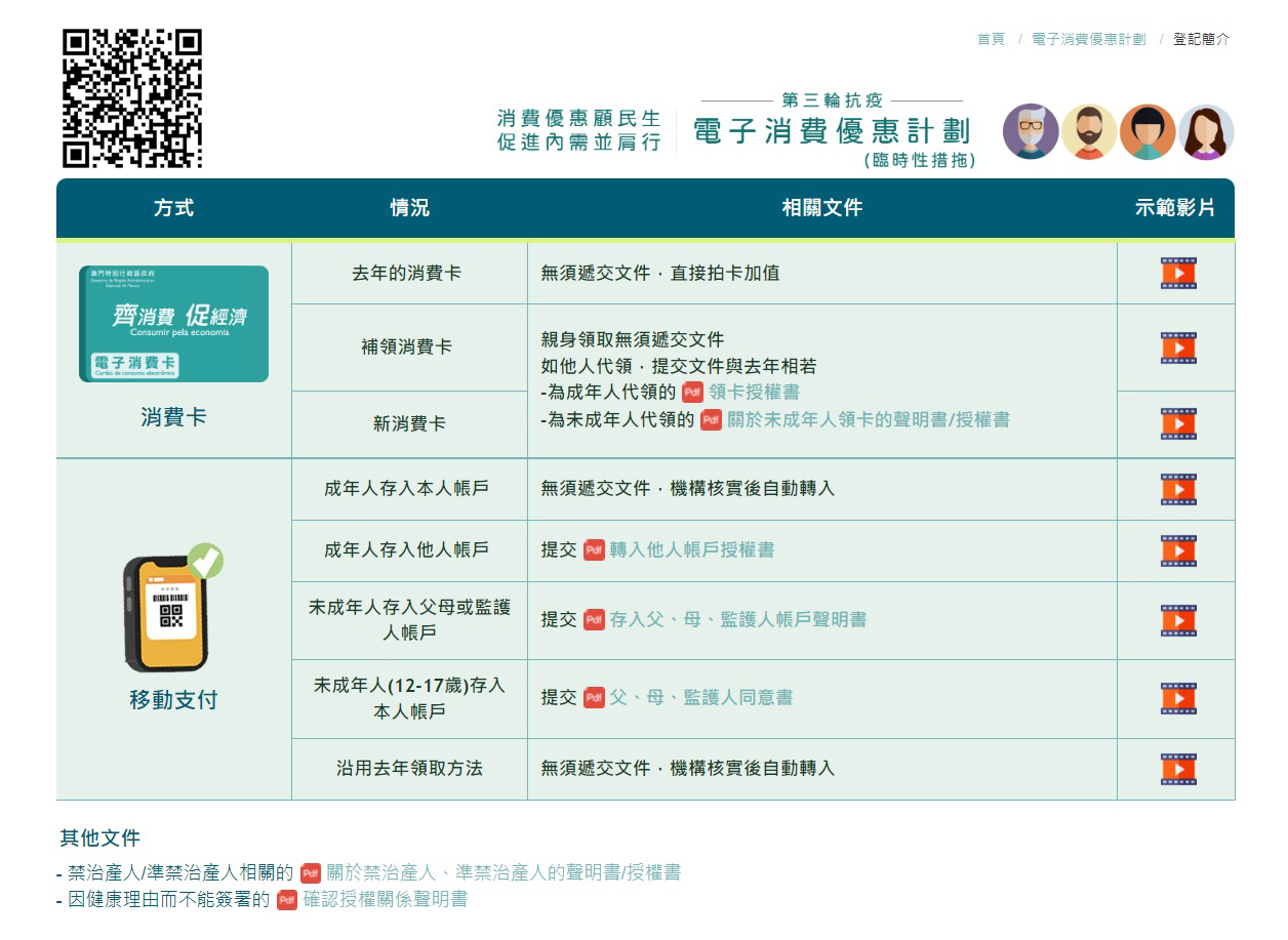 為方便居民瞭解不同領取方式的登記流程及所需文件,“專題網頁”的“登記須知”欄目內( https://www.dsedt.gov.mo/econsumo/zh-hant/reg_info.jsp#a2_1 ),及金管局登記網頁(https://registration.amcm.gov.mo/econsumption/documentchecklist_zh.html )已列出有關資訊及演示短片,方便居民查閱。