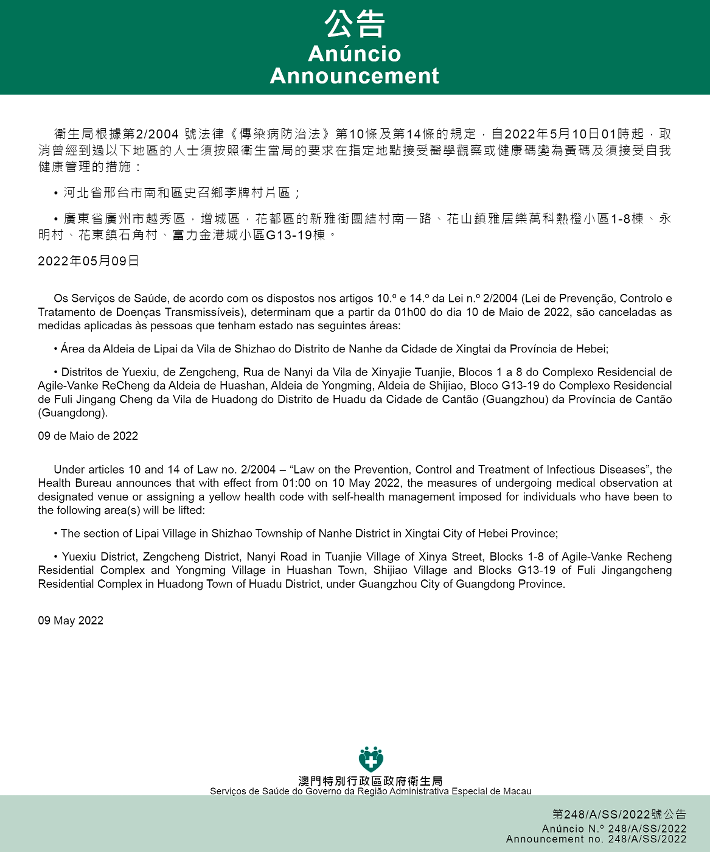 新型冠狀病毒感染應變協調中心(下稱應變協調中心)宣佈,因應內地的疫情變化,衛生局根據第2/2004號法律《傳染病防治法》第10條和第14條的規定,自2022年5月10日凌晨1時起,所有曾經到過以下地點的入境及已入境人士,須按照衛生當局的要求在指定地點接受醫學觀察至離開當地後14天但最短不少於7天: