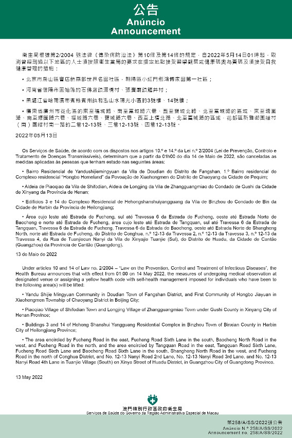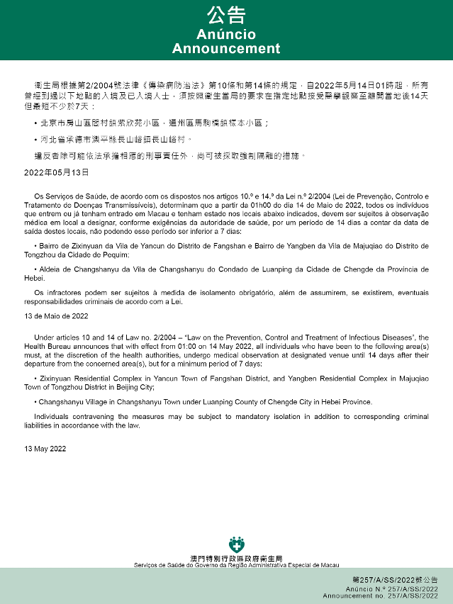 新型冠狀病毒感染應變協調中心(下稱應變協調中心)宣佈,因應內地的疫情變化,衛生局根據第2/2004號法律《傳染病防治法》第10條和第14條的規定,自2022年5月14日凌晨1時起,所有曾經到過以下地點的入境及已入境人士,須按照衛生當局的要求在指定地點接受醫學觀察至離開當地後14天但最短不少於7天: