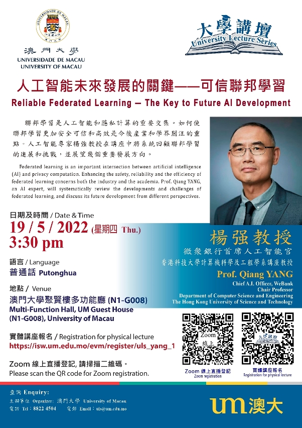 澳門大學將於5月19日(星期四)舉辦“大學講壇”講座,由微眾銀行首席人工智能官、香港科技大學計算機科學及工程學系講座教授楊強擔任講者,就“人工智能未來發展的關鍵——可信聯邦學習”為題發表演說,探討人工智能的前沿技術和未來發展重點。