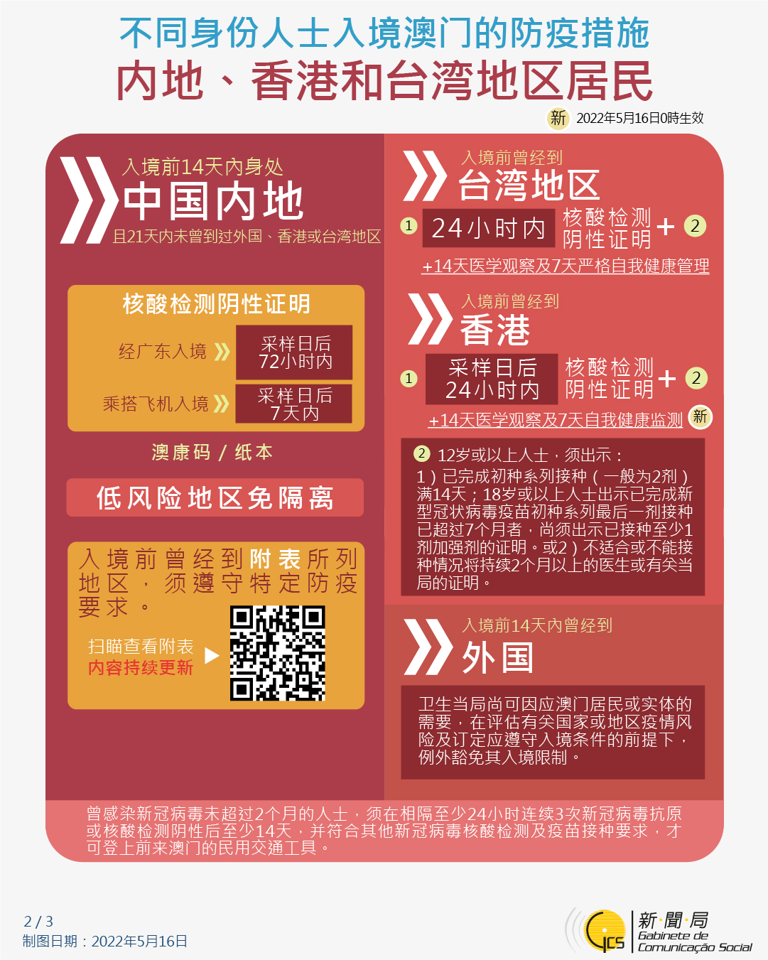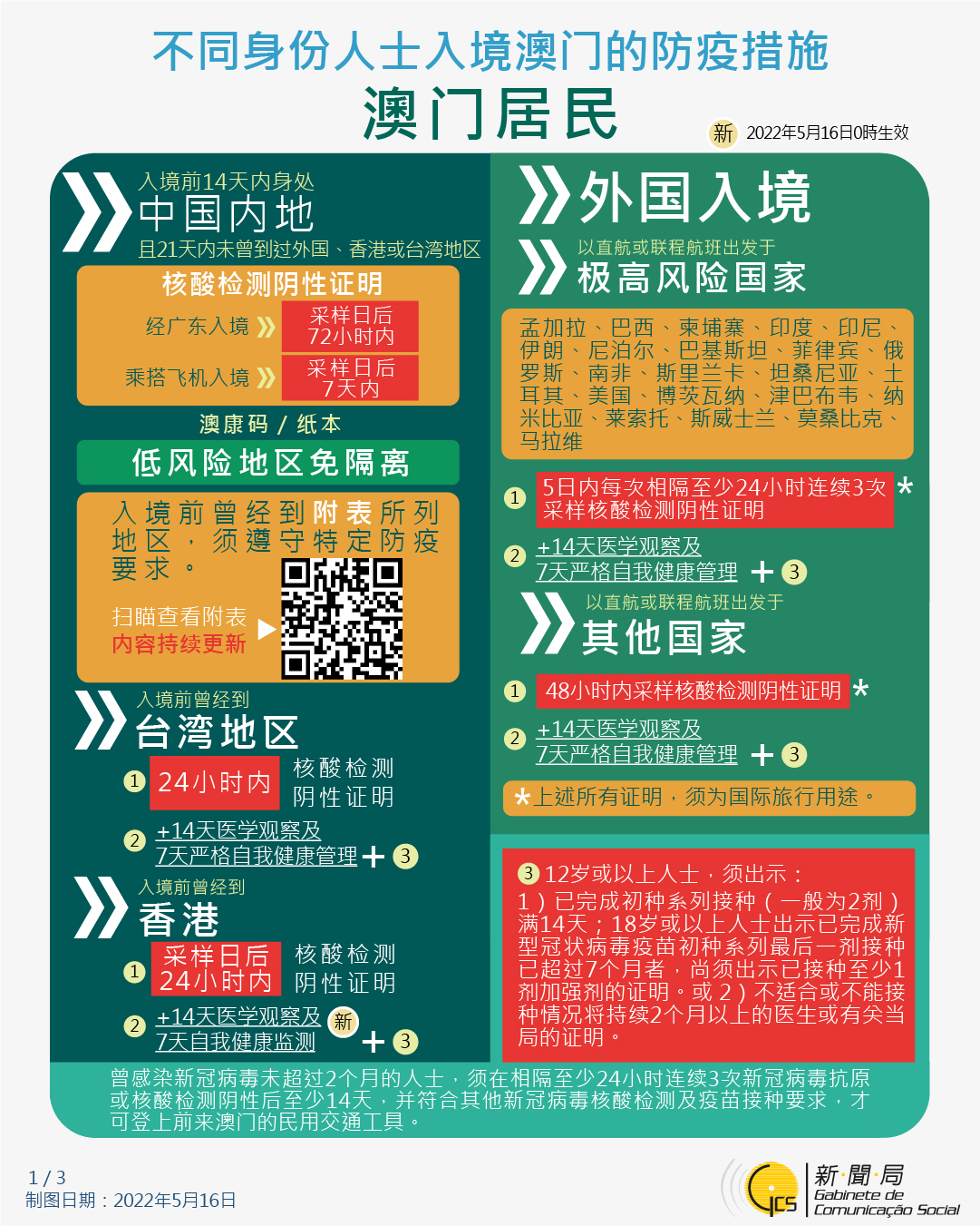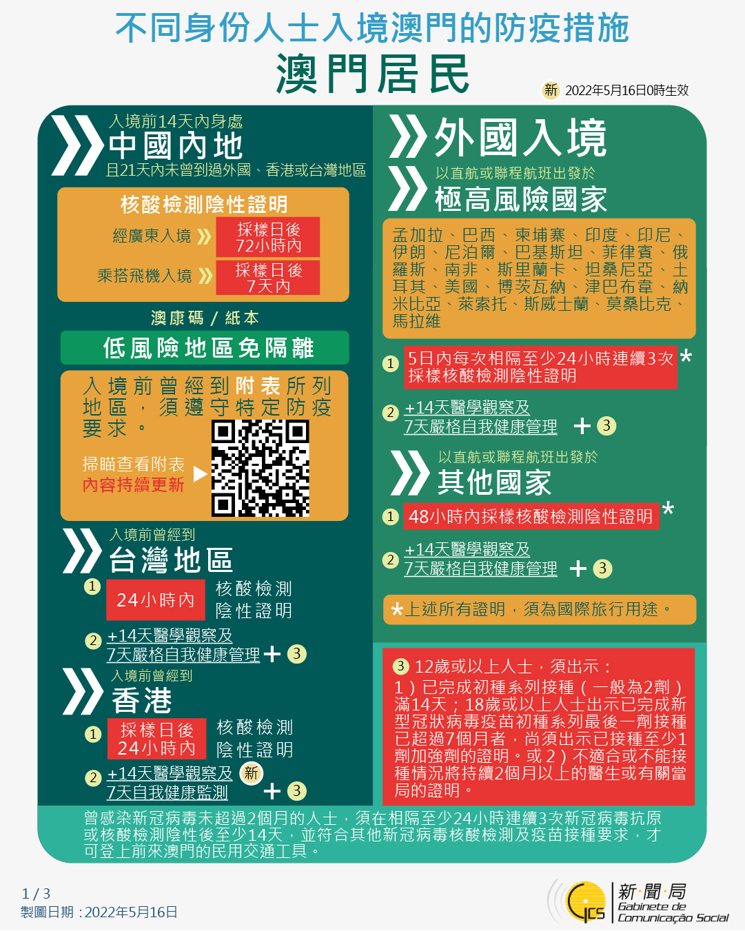 【圖文包】2022/5/16最新入境澳門的防疫措施