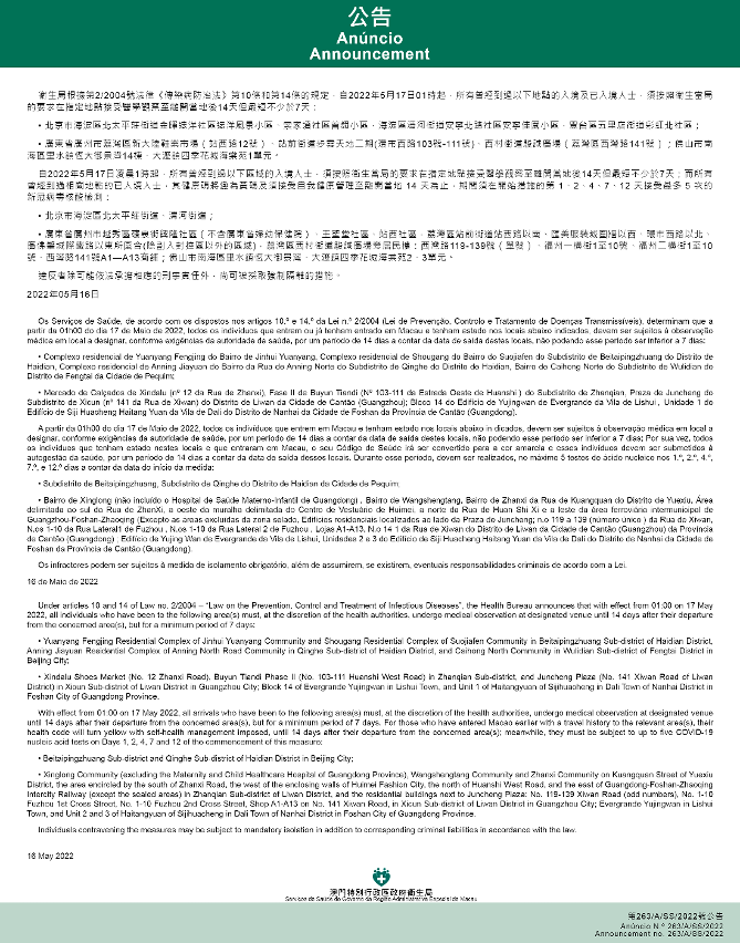 新型冠狀病毒感染應變協調中心(下稱應變協調中心)宣佈,因應內地的疫情變化,衛生局根據第2/2004號法律《傳染病防治法》第10條和第14條的規定,自2022年5月17日凌晨1時起,所有曾經到過以下地點的入境及已入境人士,須按照衛生當局的要求在指定地點接受醫學觀察至離開當地後14天但最短不少於7天: