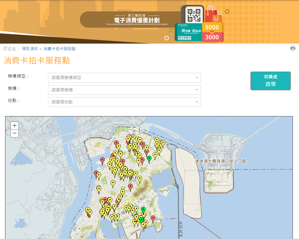 如屬領取新卡(如遺失或從未領取消費卡)的情況,居民亦需於明(23)日起按登記時選定的日期和地點,到指定的政府部門服務點領取新卡。領卡服務點的地址可於計劃專頁查閱(https://www.dsedt.gov.mo/econsumo/zh-hant/pickup_card_loc.jsp)。