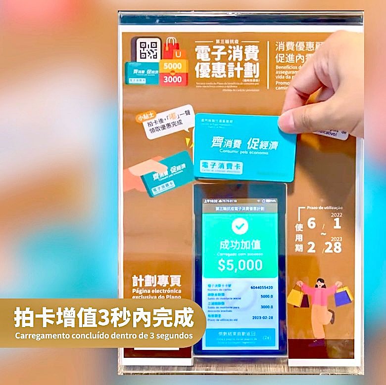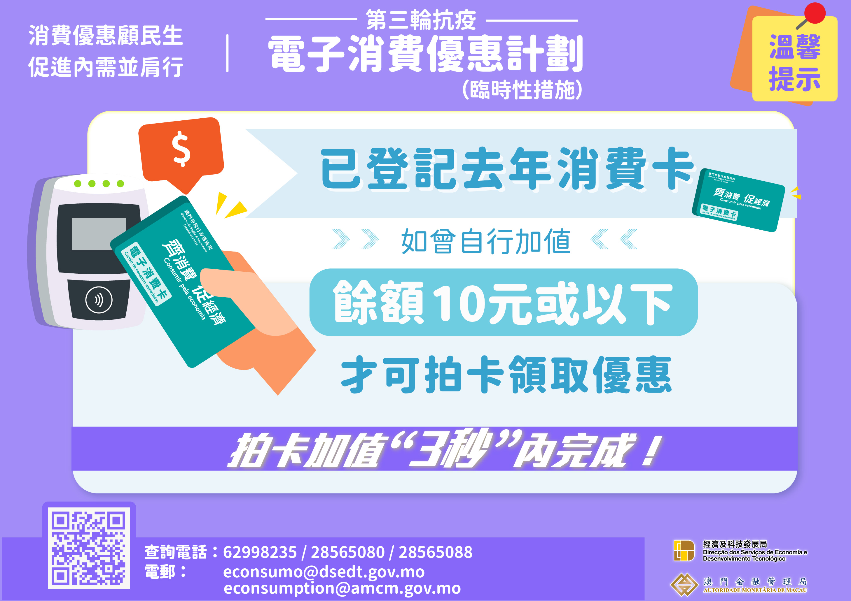 需要注意的是,如曾自行加值消費卡,需要先將卡內餘額用至10澳門元或以下,才可拍卡領取消費優惠。拍卡服務點可於計劃專頁查閱(https://www.dsedt.gov.mo/econsumo/zh-hant/topup_loc.jsp)。